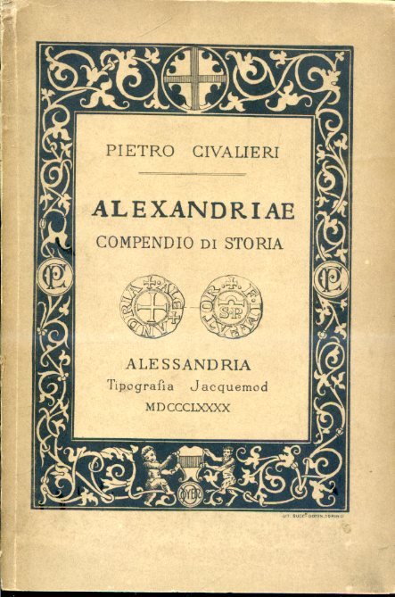 In-8°, pp. 106, brossura editoriale marrone con titolo e riproduzione di un sigillo entro elegante bordura litografica figurata su fondo nero. Frontespizio entro identica bordura. Un ritratto dell'autore f.t. Una tav. f.t. riproducente il monumento al patrizio alessandrino Guglielmo Inviziati. Dedica a stampa al generale Lanzavecchia di Burio. Ottimo stato. Edizione, postuma, pubblicata per le cure del figlio dell'autore, A. Civalieri Inviziati di Masio, di questo compendio di storia alessandrina pubblicato per la prima volta nel 1845. In fine è riprodotta l'ode 'Alessandria fedele', composta nel 1842 per le nozze di Vittorio Emanuele di Savoia e di Maria Adelaide d'Austria. Raro. Cfr. Manno, II, 7977 (edizione originale). Bibliografia Nazionale - 1890, 7545.