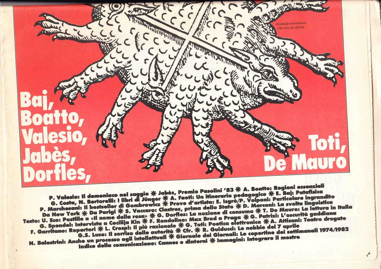 In-folio, pp.24, a fasciolo. Scritti di P. Valesio, Jabes, A. Boatto, G. Costa, N. Bertorelli, A. Faeti, E. Baj, P. Marchesani, E. Isgr/P. Volponi, S. Vaccaro (Clastres, prima dello stato!), D. Marconi, U. Eco, G. Dorfles, T. De Mauro, G. Spendel, F. Rondolino, G. Patrizi, F. Garritano, L. Crespi, G. Toti, A.Attisani, G.S. Luso, R. Guiducci, N. Balestrini, Immagini: Integrare il mostro
