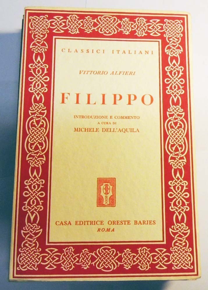 Vittorio Alfieri, Filippo, introduzione e commento a cura di Michele Dell’Aquila, Casa Editrice Oreste Barjes, Roma 1962, pp. XXXVI, 123, 2 c. di tavv. f. t. ill. b. n., cm 21, br. ed. Collana Classici italiani. Perfetto.