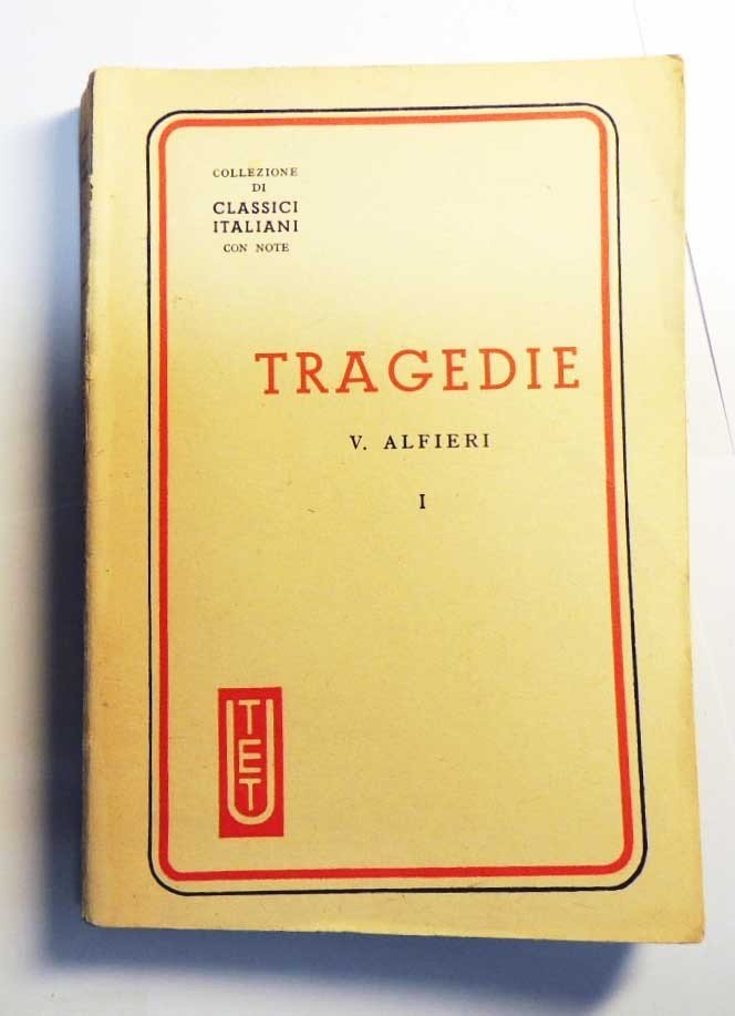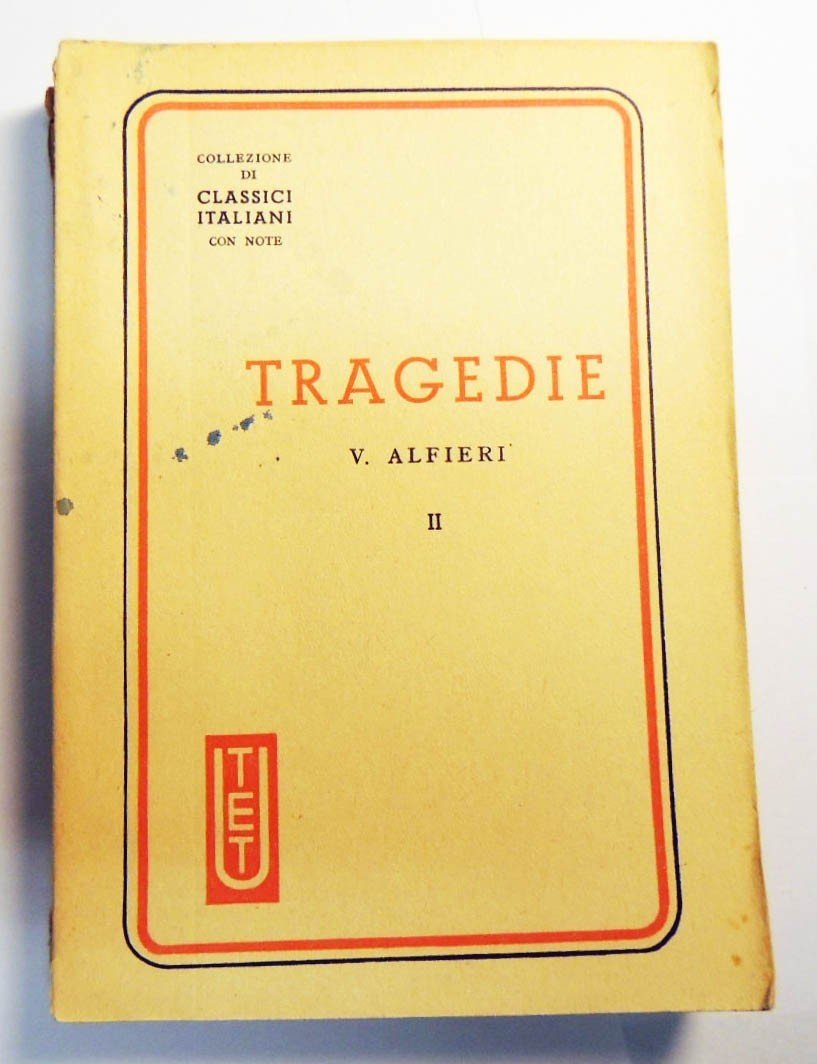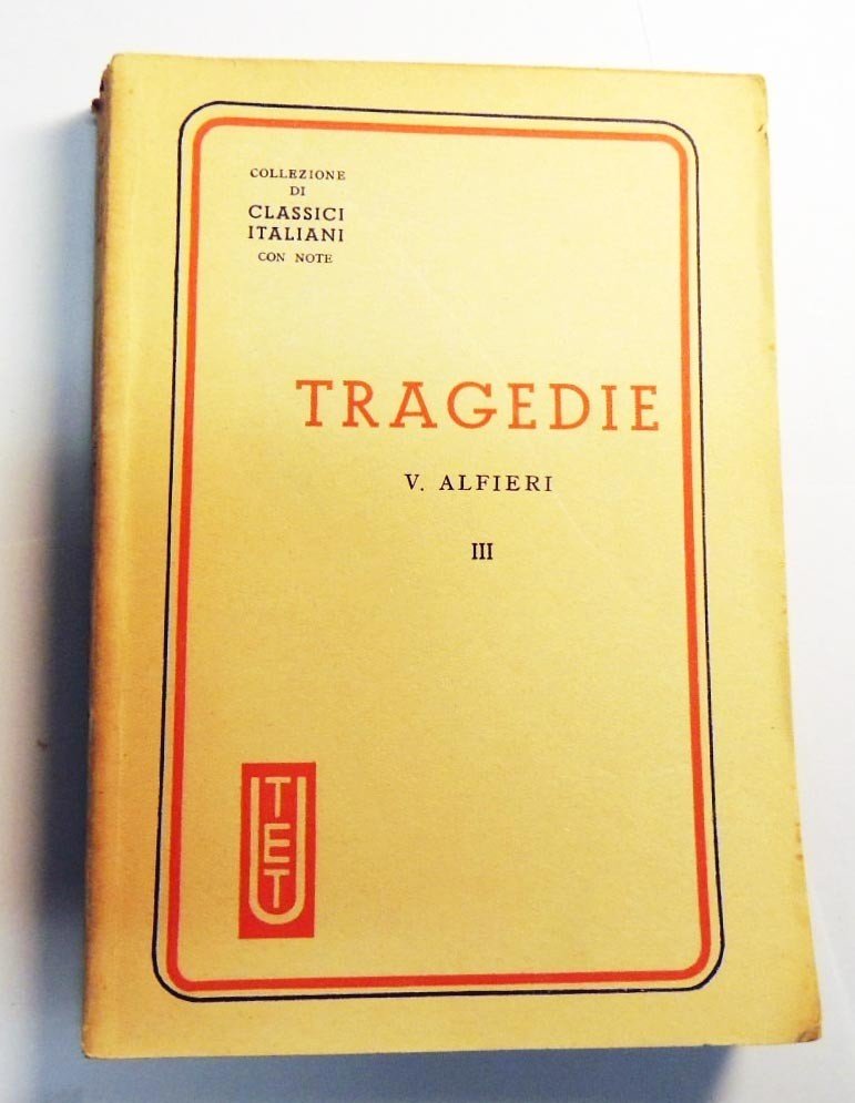 Vittorio Alfieri, Tragedie, a cura di R. Dusi, Unione tipografico-editrice torinese, Torino 1944, 3 voll., pp. XVII, 1108, cm 17, br. ed. Collana Collezione di classici italiani con note, n. 9-11. Vol. I: Filippo, Polinice, Antigone, Virginia, Agamennone, Oreste. Vol. II: La congiura de’ pazzi, Don Garzia, Maria Stuarda, Rosmunda, Ottavia, Timoleone, Merope. Vol. III: Saul, Agide, Sofonisba, Mirra, Bruto Primo, Bruto Secondo, Alceste. Strappetti e piccole mancanze ai dorsi, primo fascicolo del primo volume impercettibilmente allentato, per il resto esemplari ben conservati.