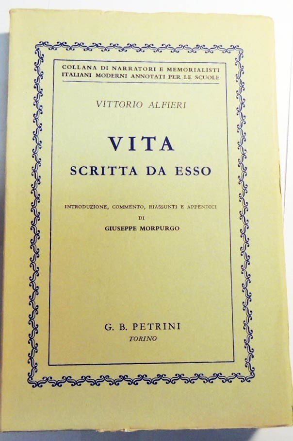 Vittorio Alfieri, Vita scritta da esso, introduzione, commento, riassunti e appendici di Giuseppe Morpurgo, G. B.Petrini, Torino 1959, pp. 358, 16 c. di tavv. f. t. ill. b. n., cm 20, br.ed. Collana di narratori e memorialisti italiani moderni annotati per le scuole. Perfetto.