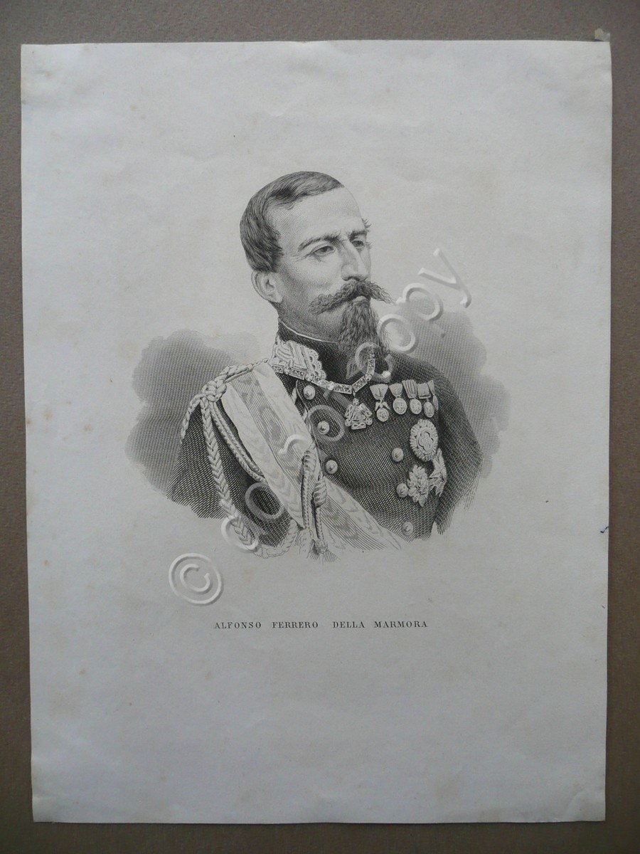 Incisione, Alfonso Ferrero Della Marmora S.d. (1860-70 circa), incisione in rame su carta, cm 23,5x17,5. Condizioni di conservazione Esemplare in buone condizioni con tracce d'uso, piccole lievissime bruniture, retro con alcune tracce di nastro adesivo e una minima abrasione dovute a precedente inserimento in album.