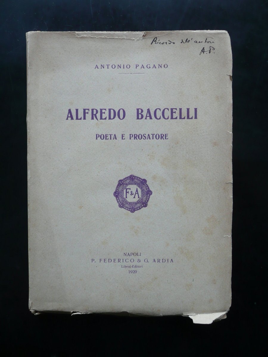 Antonio Pagano, Alfredo Baccelli Poeta e prosatore P. Federico & G. Ardia Librai-Editori, Napoli 1920, cm 20x14, pp. 174 con un ritratto fot. del Baccelli all'antiporta (vedi foto); brossura ed. Margine sup. della br. ant. con dedica autogafa e firmata dell'Autore (firma con le iniziali A.P.", vedi foto). Condizioni di conservazione Esemplare in buone condizioni con tracce d'uso; alcune piccole lievi bruniture; margini e angoli delle brossure con alcuni piccoli strappetti e pieghette; margine sup. della br. ant. con una piccola mancanza. Interni buoni, margini di alcune pagine con minime irregolarità provocate dall'apertura maldestra di esemplare intonso. Margine superiore della brossura anteriore con dedica autogafa e firmata dell'Autore (firma con le iniziali "A.P.", vedi foto). SETT88.L7962 N "