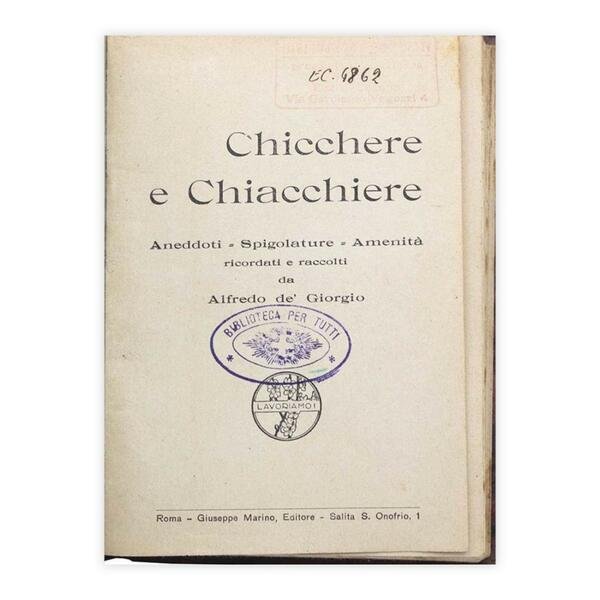 Autore: Alfredo de' Giorgio Titolo: Chicchiere e Chiacchiere Sottotitolo: Aneddoti - Spigolature - Amenità ricordati e raccolti da Alfredo de' Giorgio. Edizione: Roma, Giuseppe Marino Editore Dimensioni: 11,5 x 16,5 cm c.a. Pagine: 163 Copertina: Rigida Condizioni: Buone come da foto