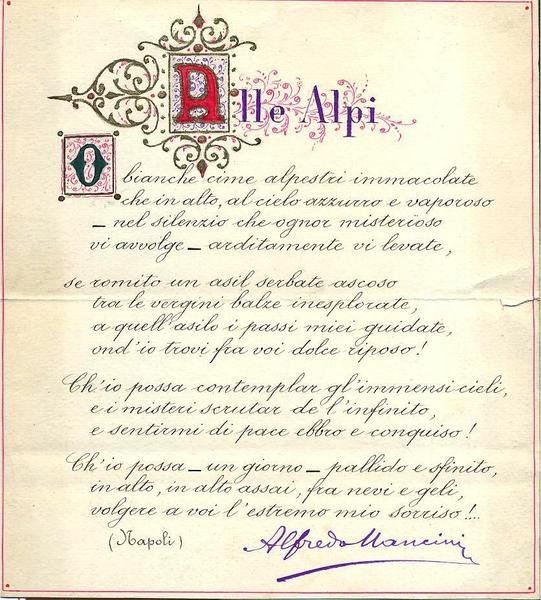 Alfredo Mancini. Napoli. Poeta. Cartoncino dipinto a mano con bella poesia e firmato.