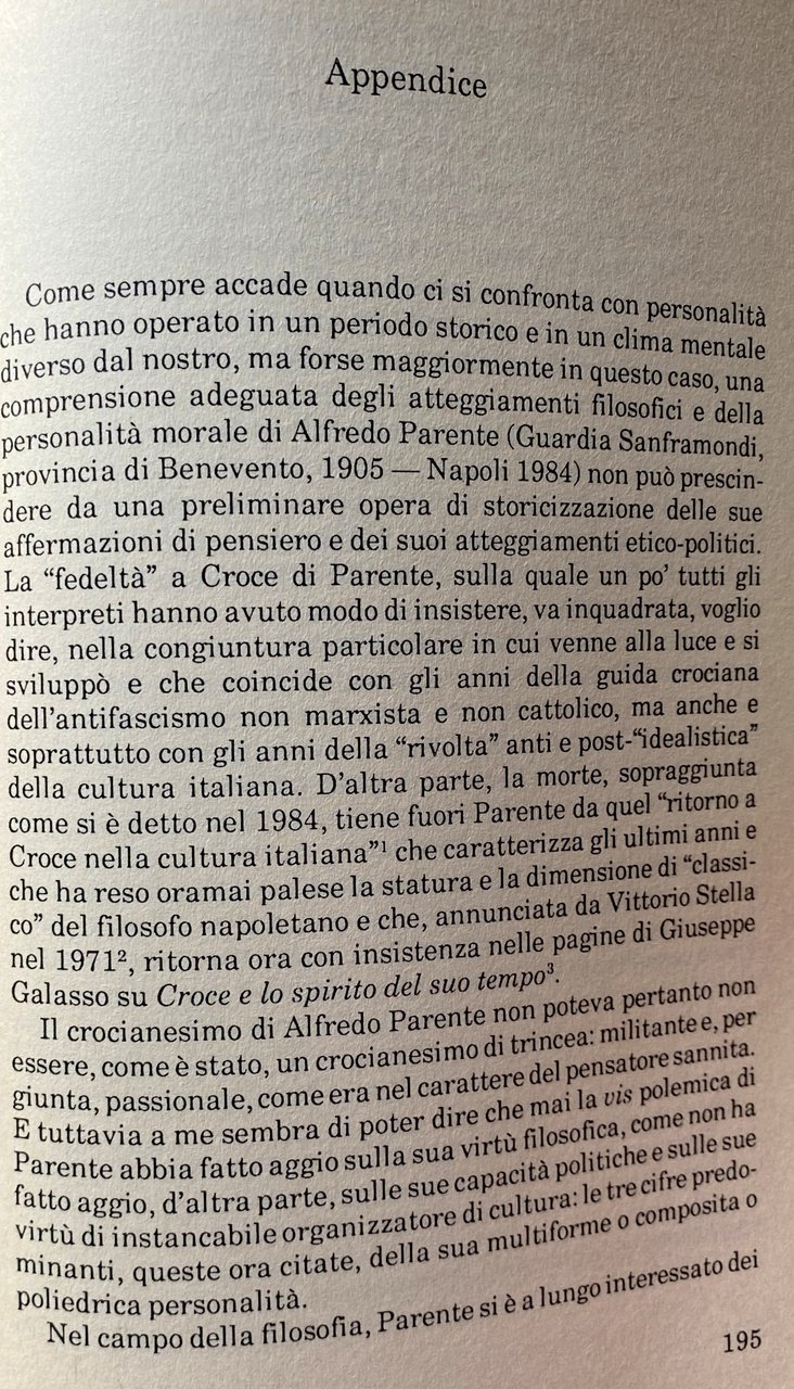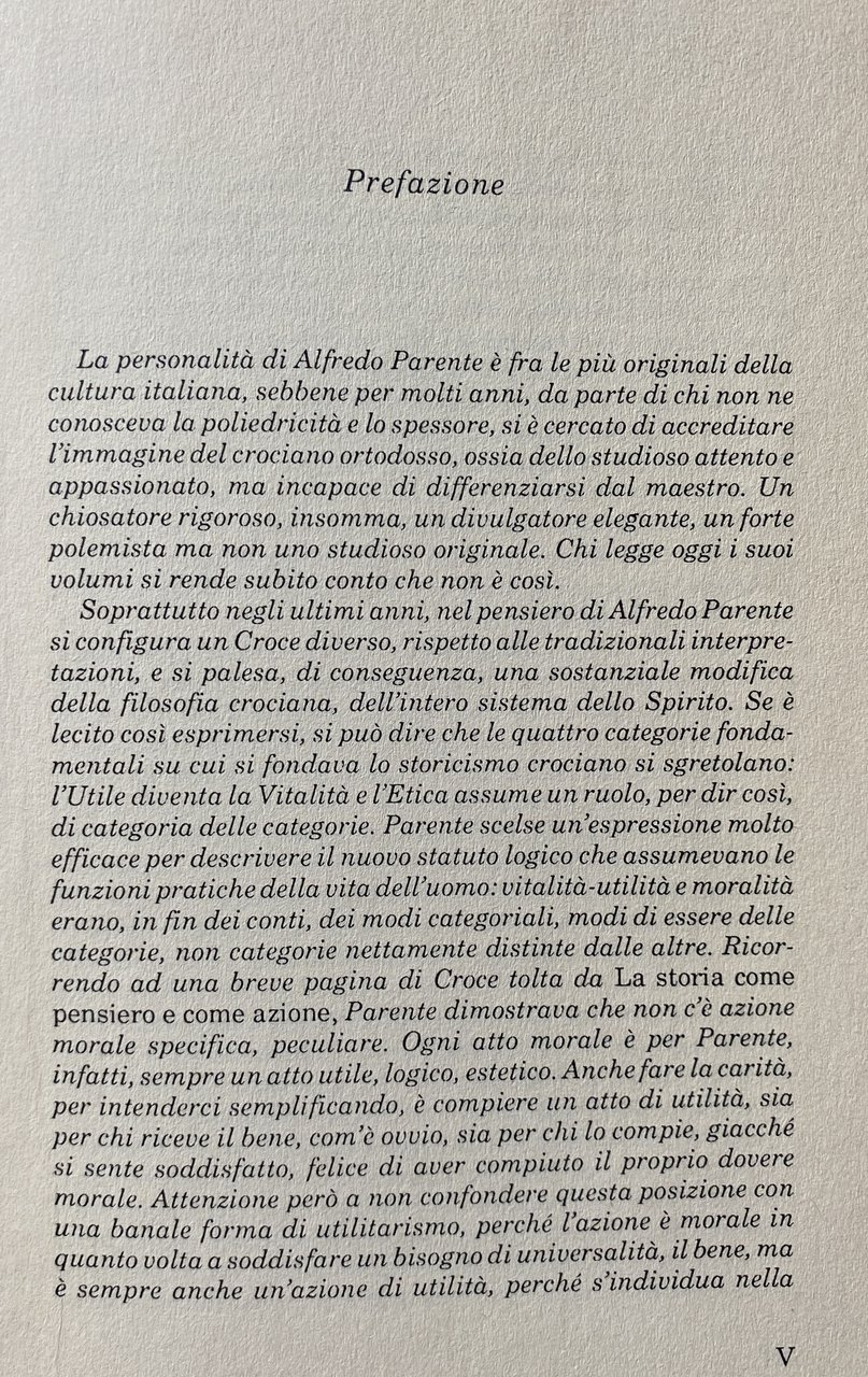 Studioso di estetica, musicologo e critico musicale, organizzatore di cultura e fondatore della Rivista di studi crociani, uomo politico liberale, Alfredo Parente (1905-1984) è stata una figura poliedrica di intellettuale crociano. Come per Croce, a cui lo ha legato un'assidua frequentazione, la filosofia era per Parente non una disciplina speciale, ma una funzione dello spirito umano. Il filosofare, in tale prospettiva, non poteva pretendere a nessuna prerogativa, essendo l'uomo che giustifica il filosofo piuttosto che il contrario. Le pagine che qui si pubblicano, in collaborazione con l'Assessorato alla Pubblica Istruzione della Provincia di Benevento, testimoniano compiutamente il contributo di Parente alla storia del crocianesimo e, nel contempo, l'humanitas che costituisce la cifra della sua attività.