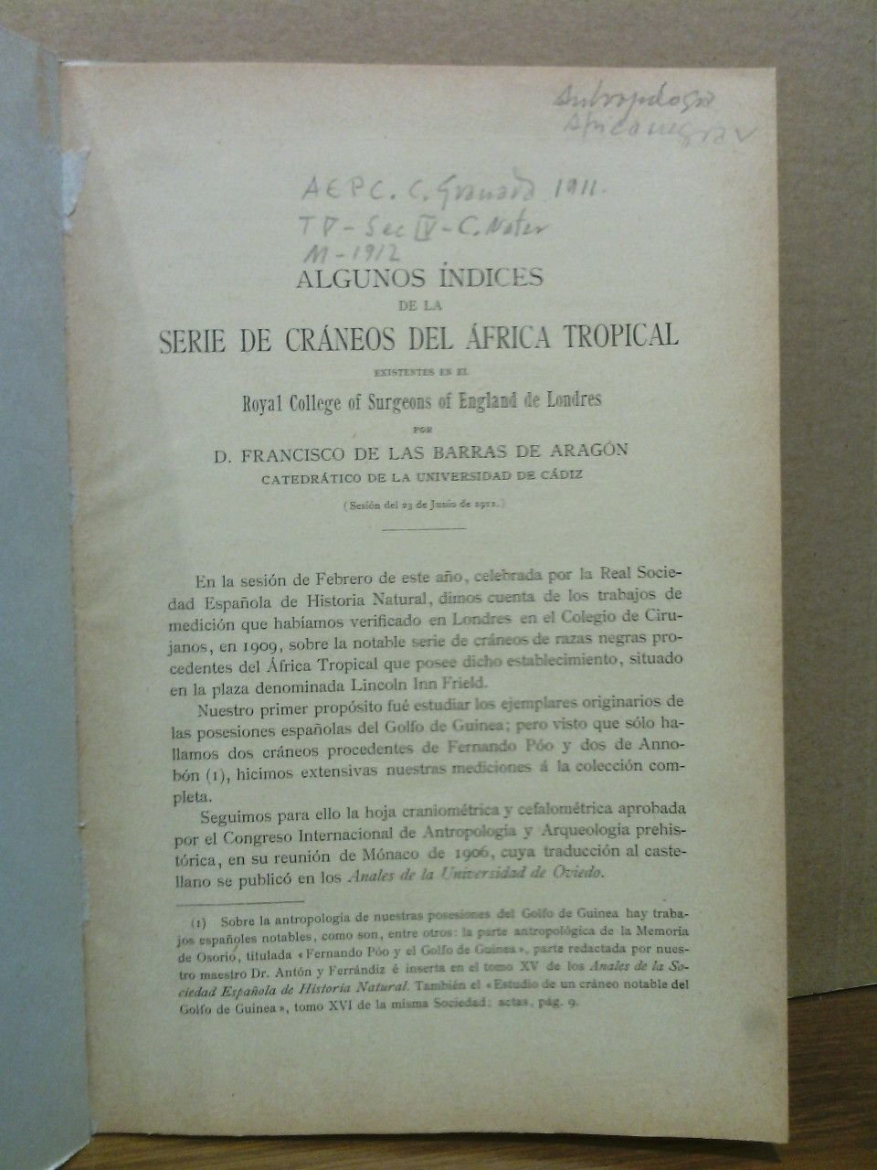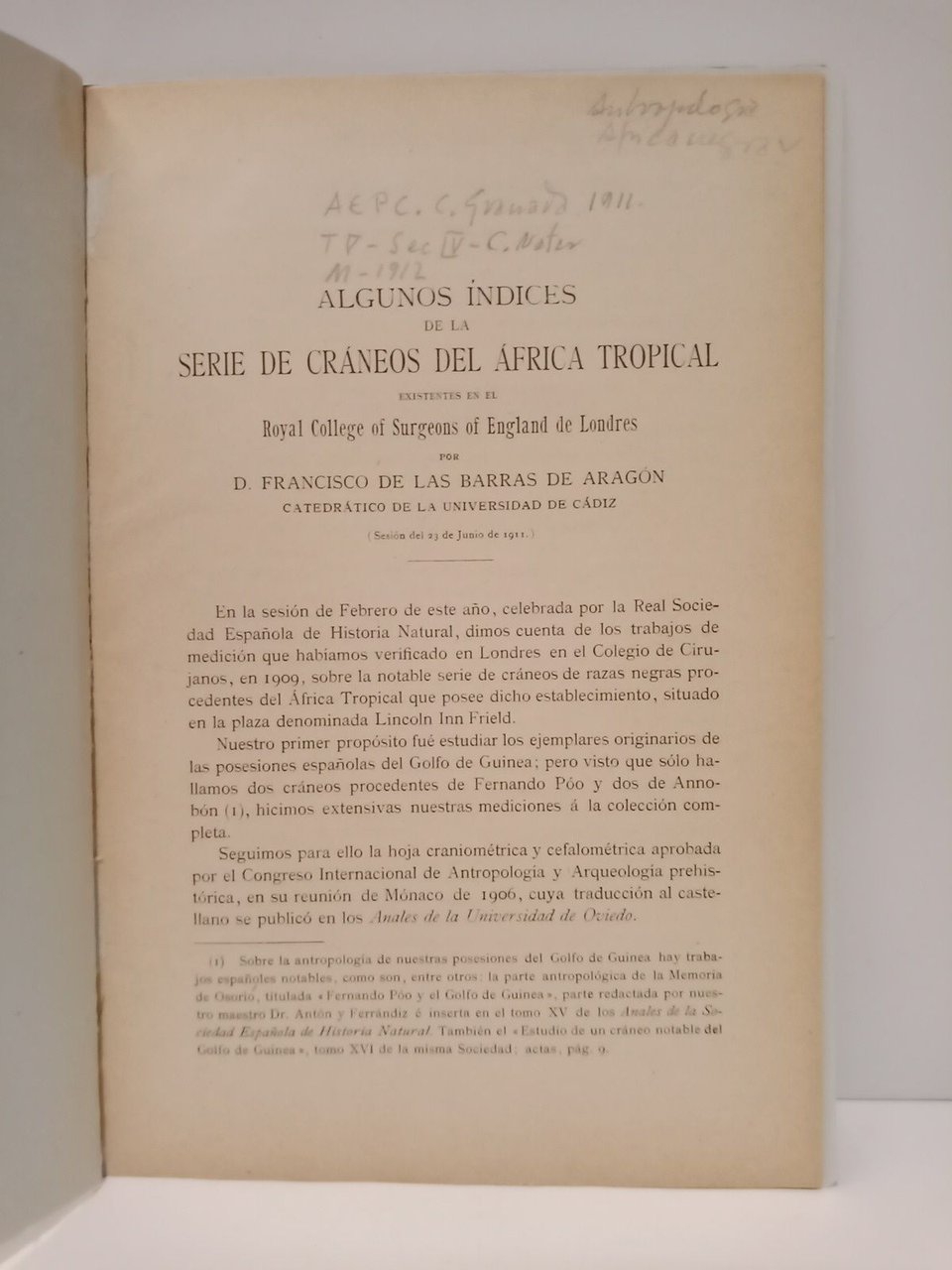 [Madrid]: Asoc. Esp. para el Progreso de las ciencias, [ca. 1912].- P. 15-28 (en total 14 p.); 4º (22,5 x 15,3 cm.); Cubiertas provisionales.- Desglosado del Boletín de la "Asociación Española para el Progreso de las Ciencias". Tomo V. Sección 4ª Ciencias Naturales. Congreso de Granada 1911).* Por carecer de cubiertas, se le han puesto unas de papel para su mejor conservación. ÁFRICA NEGRA EN GENERAL