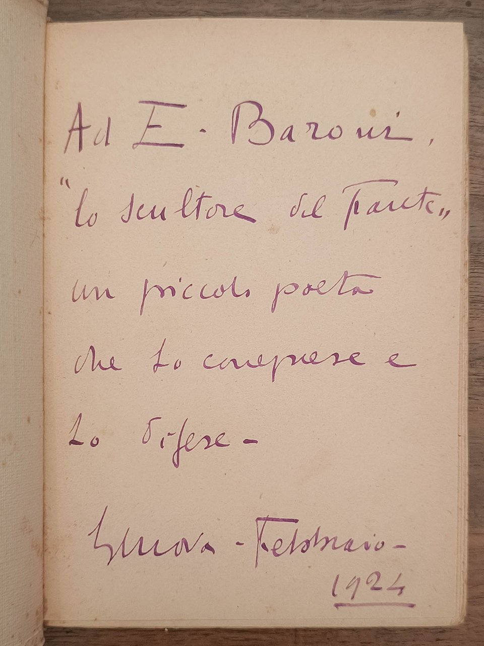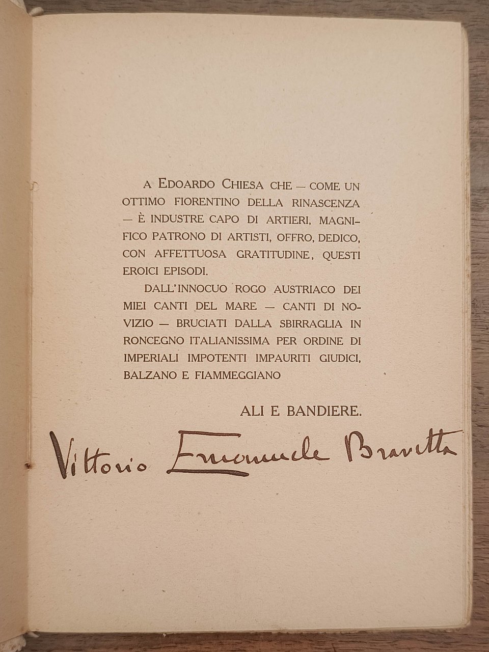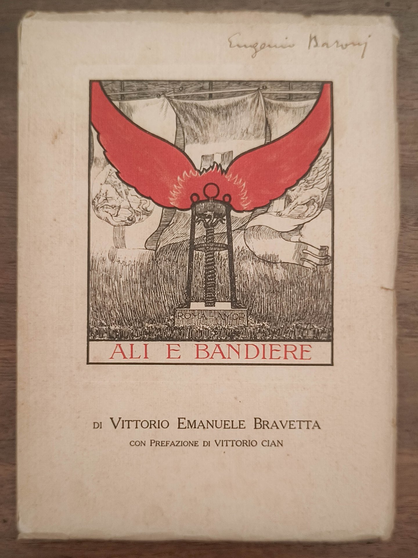 Ali e bandiere con prefazione di Vittorio Cian, Milano, Varietas, 1918. Prima edizione. Cm 18,5. Pp. 7 IX 130. Brossura editoriale illustrata. Alone al secondo piatto, altrimenti ottimo esemplare. Raccolta di poesie dedicate alla Prima Guerra Mondiale. Bella dedica dell'autore allo scultore genovese Eugenio Baroni: A E. Baroni "lo scultore del Fante" un piccolo poeta che lo difese e lo comprese. Genova, Febbraio 1924. Firma dell'autore alla pagina della dedica e firma di appartenenza dello scultore Baroni al piatto.