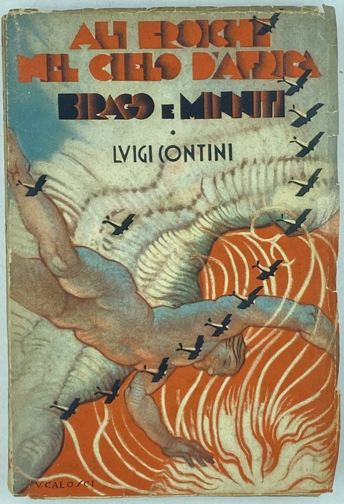 Brossura editoriale illustrata, cm 19 x 13.5, pp 203 (5) con 22 tavole in nero. Buon esemplare a fogli chiusi con qualche lieve segno del tempo. Rara pubblicazione di Luigi Contini, pilota nella 50a Squadriglia durante la Grande Guerra, e autore di numerosi lavori sull'aviazione militare italiana, dedicata alla memoria di Dalmazio Birago e Tito Minniti, caduti nella guerra d'Etiopia. Il volume fa parte della serie Ali Eroiche nel Cielo d'Africa di cui le Edizioni della Propaganda Aviatoria pubblicarono solo due dei sei titoli annunciati, entrambi di Contini (oltre a questo «L'aviazione in A.O. traverso i comunicati» del 1937). Copertina di V. Calosci.