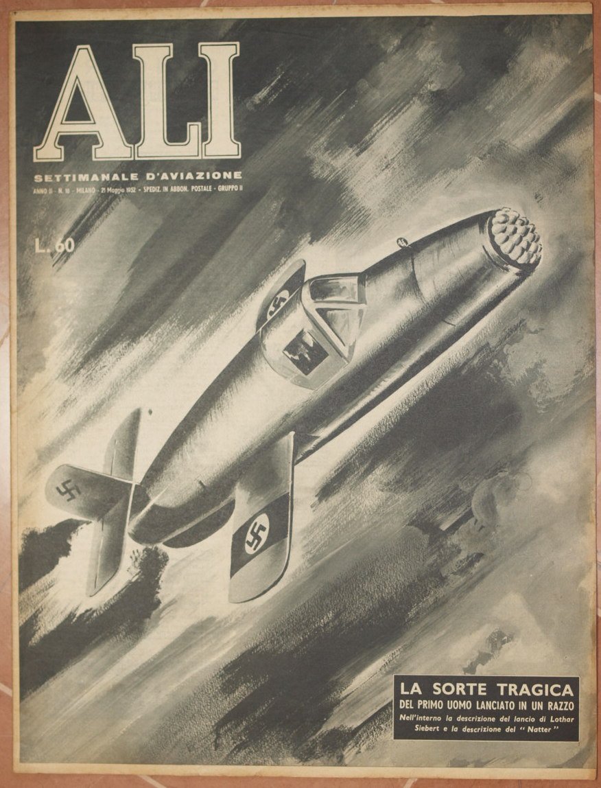 In folio. Dim. 39x27,5 cm. Pp. da 222 a 232+(4). Numero del 21 maggio 1952 della rivista settimanale "Ali" di aviazione. "Ali" il periodico degli aviatori italiani nasce a Milano il 28 Marzo 1944 per essere pubblicato fino al 28 Aprile 1945 quando si interruppe a causa della guerra. Riappare nel 1951 fino al 1977 variando più volte di nome. Tra gli articoli presenti: Thunderjet all'Italia, Breve storia degli skyblazers, Il primo uomo lanciato in un razzo, Mario Nuovo, La coppa L. Rossi a Milano, Cesena ecc. Numerose notizie di attualità e foto d'epoca all'interno. In buone condizioni. Copertina editoriale in buone condizioni generali con lievi usure ai margini e dorso. Legatura assente. All'interno le pagine si presentano in ottime condizioni con rare fioriture. Number of the 21st of may 1952 of the weekly magazine "Ali" of aviation.<BR>"Ali" the magazine of italian aviators was born in Milan the 28th of March 1944 to be published until the 28th of April 1945 when it was blocked due to the war. It reappeared in 1951 until 1977 changing names different times. Between the articles inside: Thunderjet to Italy, Brief history of skyblazers, The first man launched ina race, Mario Nuovo, Cup L. Rossi in Milan, Cesena etc. Different information of actuality and photoes inside. In good conditions. Editorial cover in good general conditions slightly worn in the edges and spine. Binding in good conditions. Inside pages are in good conditions with occasional foxings.