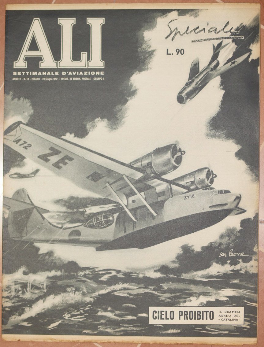 In folio. Dim. 39x27,5 cm. Pp. da 270 a 280+(12). Numero del 28 giugno 1952 della rivista settimanale "Ali" di aviazione. "Ali" il periodico degli aviatori italiani nasce a Milano il 28 Marzo 1944 per essere pubblicato fino al 28 Aprile 1945 quando si interruppe a causa della guerra. Riappare nel 1951 fino al 1977 variando più volte di nome. Tra gli articoli presenti: Caproni F. 5, D.a.t., Identificazione dei velivoli all'A.g.a., paracadutismo, Air France novita, Gentiluomini a Linate, Arcangeli sul vittoriale, Cirie, meeting a Digione, Gran Premio a Asti, Biella, Emilio Medail ecc. Numerose notizie di attualità e foto d'epoca all'interno.<BR>In buone condizioni. Copertina editoriale in buone condizioni generali con lievi usure ai margini e dorso. Legatura assente. All'interno le pagine si presentano in ottime condizioni con rare fioriture. Number of the 28th of june 1952 of the weekly magazine "Ali" of aviation. "Ali" the magazine of italian aviators was born in Milan the 28th of March 1944 to be published until the 28th of April 1945 when it was blocked due to the war. It reappeared in 1951 until 1977 changing names different times. Between the articles inside: Caproni F. 5, D.a.t., Identification of airplanes in A.g.a., parachuting, Air France news, Linate, Arcangeli, Cirie, meeting in Digione, Gran Premio a Asti, Biella, Emilio Medail etc.<BR>Different information of actuality and photoes inside. In good conditions. Editorial cover in good general conditions slightly worn in the edges and spine. Binding in good conditions. Inside pages are in good conditions with occasional foxings.