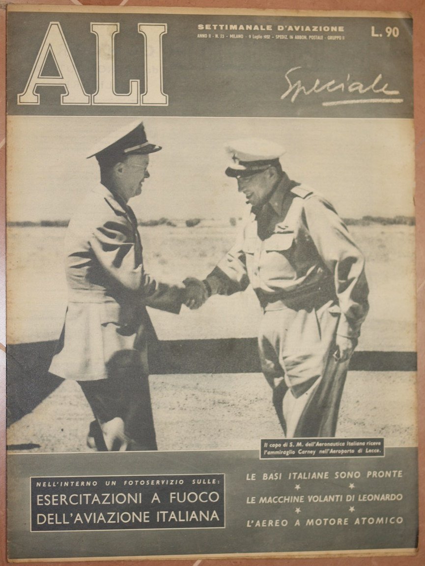 In folio. Dim. 40x30,5 cm. Pp. da 282 a 300+(4).Numero del 9 luglio 1952 della rivista settimanale "Ali" di aviazione. "Ali" il periodico degli aviatori italiani nasce a Milano il 28 Marzo 1944 per essere pubblicato fino al 28 Aprile 1945 quando si interruppe a causa della guerra. Riappare nel 1951 fino al 1977 variando più volte di nome. Tra gli articoli presenti: sondaggi stratosferici, Robert B. Carney, Ali su sette laghi, Polo Nord, Le macchine volanti di Leonardo, La propulsione nucleare negli aeroplanbi, Gala aerea su Napoli, Il reattorino F. 5 della Caproni Trento a Linate, L'infrastruttura della nuova aeronautica italiana è pronta, Locatelli Baracca ecc. Numerose notizie di attualità e foto d'epoca all'interno.<BR>In buone condizioni. Copertina editoriale in buone condizioni generali con lievi usure ai margini e dorso. Legatura assente. All'interno le pagine si presentano in ottime condizioni con rare fioriture. Number of the 9th of july 1952 of the weekly magazine "Ali" of aviation. "Ali" the magazine of italian aviators was born in Milan the 28th of March 1944 to be published until the 28th of April 1945 when it was blocked due to the war.<BR>It reappeared in 1951 until 1977 changing names different times.<BR>Between the articles inside: Robert B. Carney, Ali on seven lakes, North Pole, flying machines of Leonardo, Nuclear propulsion in airplanes, Naples, Il reattorino F. 5 of Caproni Trento in Linate, The new building is ready, Locatelli Baracca ecc.<BR>Different information of actuality and photoes inside.<BR>In good conditions. Editorial cover in good general conditions slightly worn in the edges and spine. (see the photo). Binding is almost missing. Inside pages are in good conditions with occasional foxings.