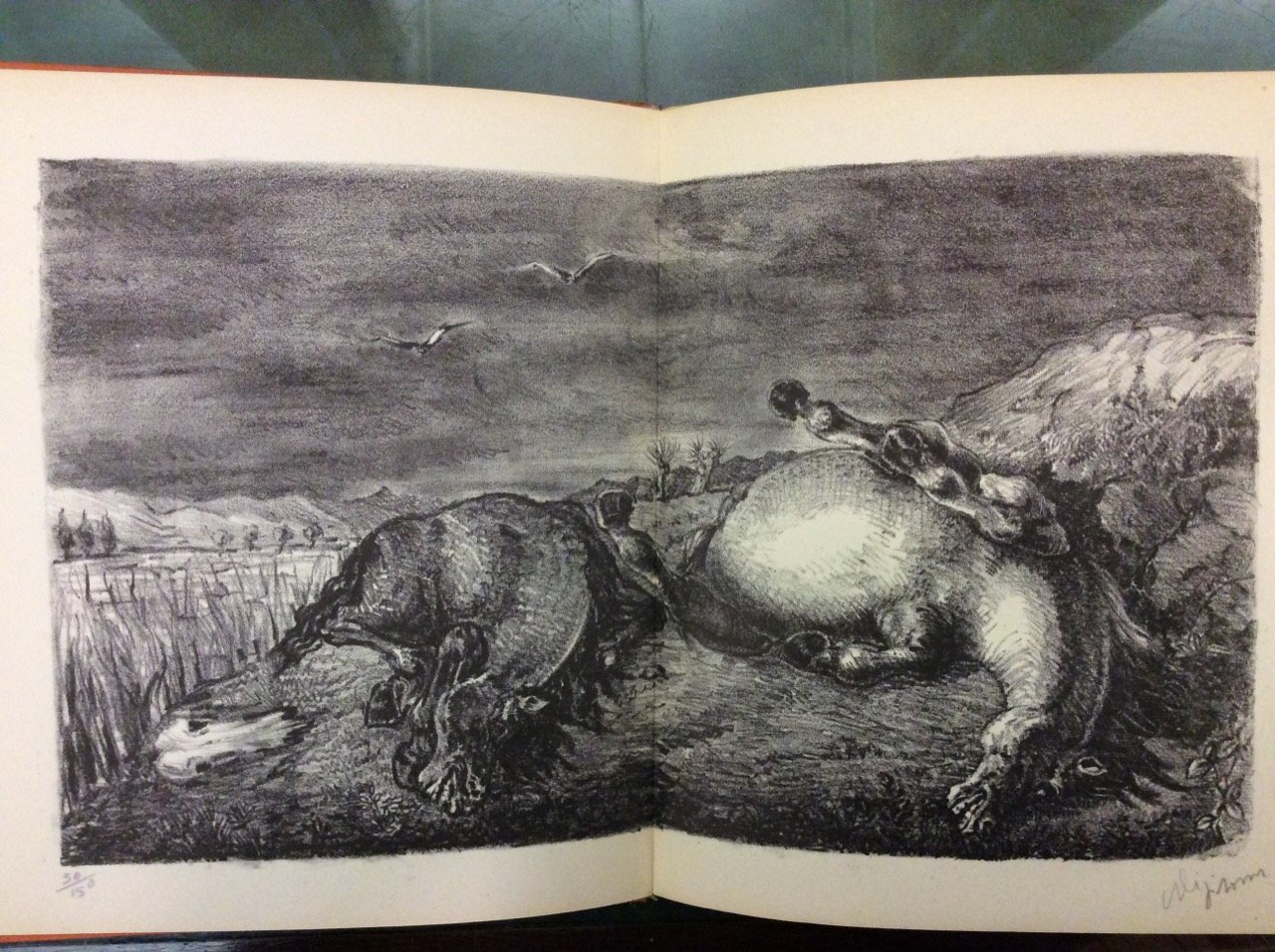 In-8 gr. (mm. 255 x 215), tela rossa edit. (tracce d'uso, dorso restaur.), pp. (4), con 1 xilografia che raffigura una testa di cavallo e 13 tavole in bianco e nero che riproducono opere di Sassu degli anni Trenta (Ciclisti - I caffè - Le ninfe - Battaglia di cavalieri - Morte di Patroclo - Solitudine..); introduz. di Luciano Anceschi. Unita 1 litografia originale, mm. 210x366, firmata dall'artista, in tirat. di 50/150. Il ns. esemplare, ad personam, è ben conservato.