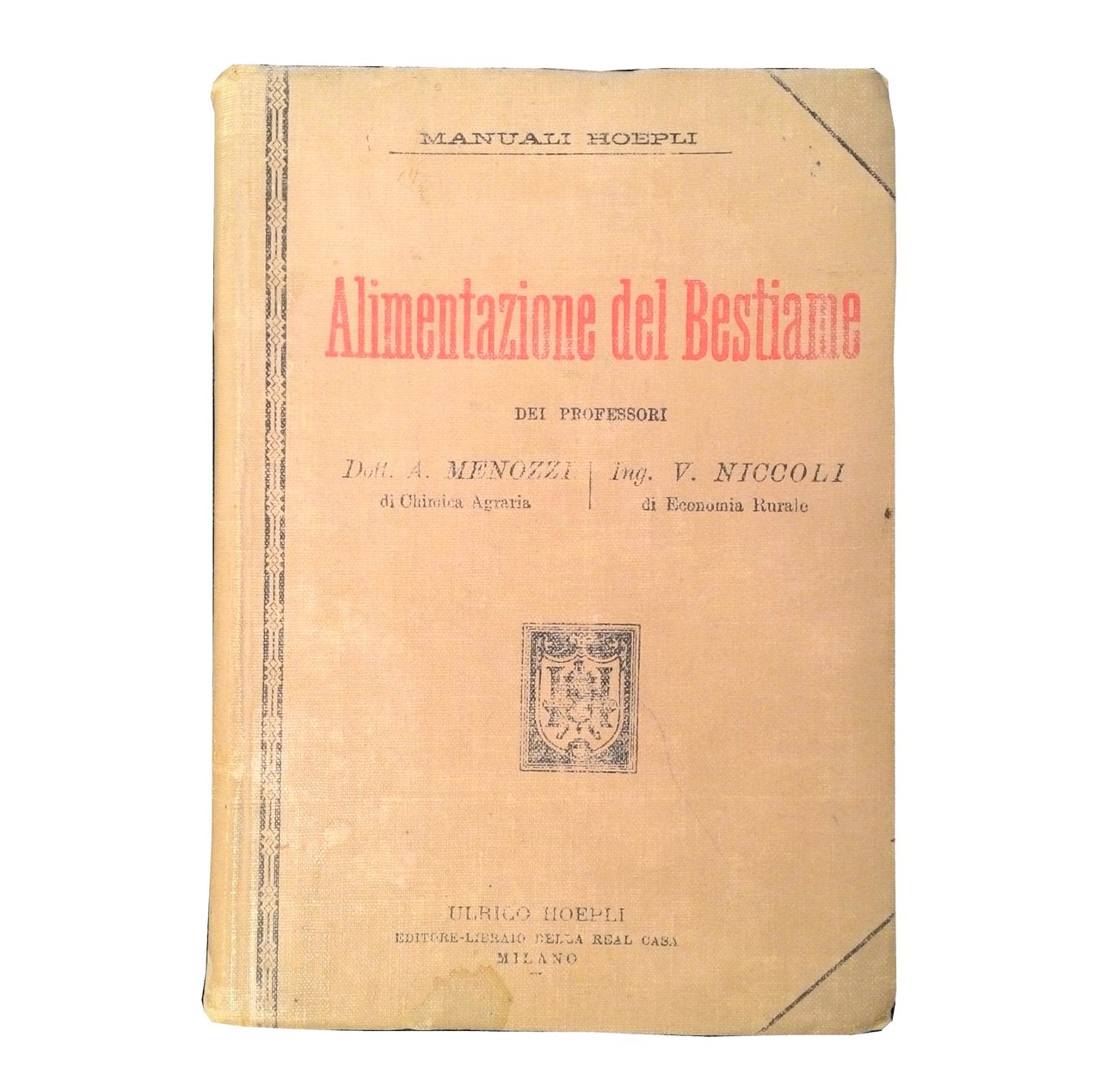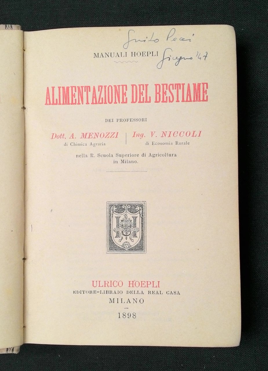 8vo (145x100 mm); leg. in tela cartonata edit. beige; pagg. XIII, (3), 399, (17)(catalogo dei 600 Manuali Hoepli pubblicati sino al 1° Marzo 1898). Prima edizione. Prov.: indicazione d'appartenenza manoscritta al frontespizio (Guido Pecci - giugno '47). Rif.: IT\ICCU\MIL\0222797. OCLC, 799332942. Cond.: stato di conservazione molto buono. -- FIRST EDITION OF THIS HANDBOOK PUBLISHED BY HOEPLI ON ANIMALS AND THEIR FEEDING. Very good condition.