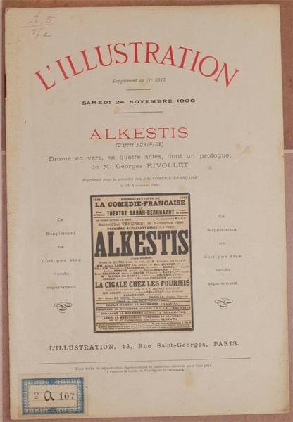 In 4. Dim. 30x20,5 cm. Pp. 16. Interessante supplemento del 24 novembre 1900 de L'Illustration. La pubblicazione riporta il pezzo teatrale in quattro atti "Alkestis" di Georges Rivollet (1852-1928). L'opera venne rappresentata per la prima volta il 16 novembre 1900 alla Comedie francaise. All'interno foto della rappresentazione. Etichetta in copertina. In buone condizioni. Copertina editoriale in buone condizioni generali con lievi usure ai margini e dorso. Legatura in buone condizioni. All'interno le pagine si presentano in buone condizioni con rare fioriture. Interesting supplement of the 24th of november 1900 of L'Illustration. In the pamphlet the piece in four acts "Alkestis" by Georges Rivollet (1852-1928). The work was represented for the first time the 16th of november 1900 in Comedie francaise. Inside photoes of representation. Label in the cover. In good conditions. Editorial cover in good general conditions slightly worn in the edges and spine. Binding in good conditions. Inside pages are in good conditions with occasional foxings.