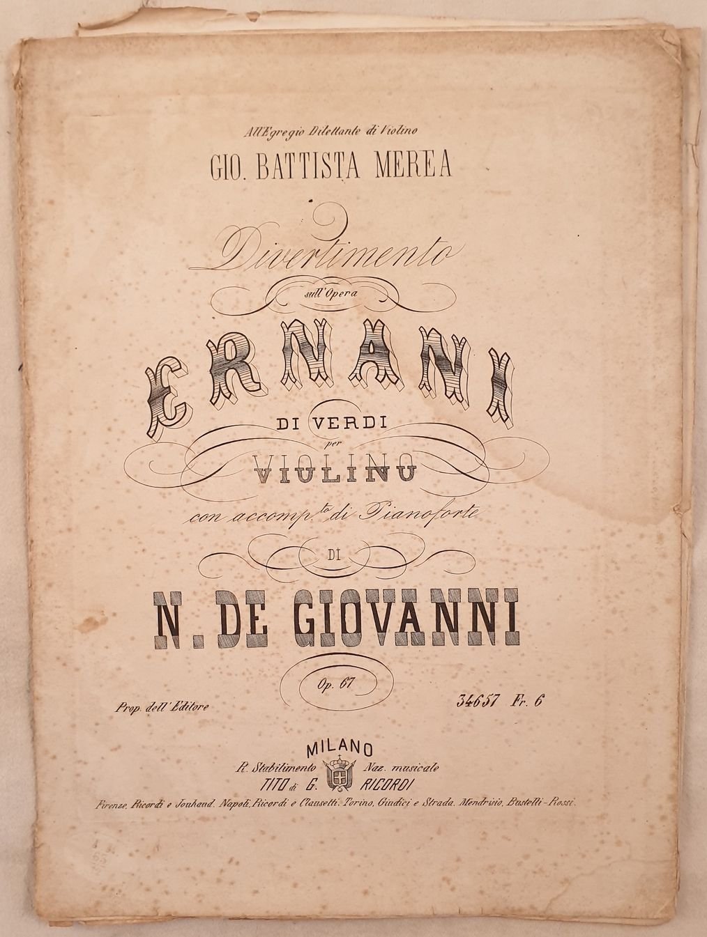 ALL'EGREGIO DILETTANTE DI VIOLINO GIO. BATTISTA MEREA DIVERTIMENTO SULL'OPERA ERNANI DI VEDI PER VIOLINO M CON ACCOMPAGNAMENTO DI PIANOFORTE DI N. DE GIOVANNI OP. 67