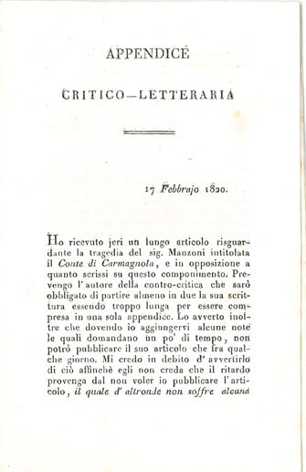 LIBROPrima edizione.Ottimo esemplare.Pubblicato come «Appendice Critico - Letteraria» il 17 Febbraio 1820. Risposta agli articoli di Francesco Pezzi su «Il Conte di Carmagnola» di Alessandro Manzoni.