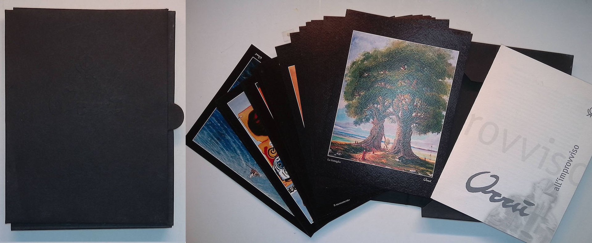 Cartellina in cartoncino flessibile con 36 stampe a colori 20x15 cm di quadri di Giancarlo Orrù. Ottime condizioni.