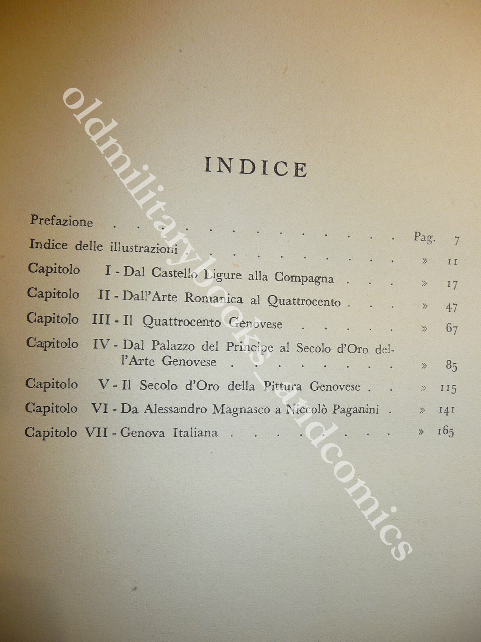 Ricercato vol. di storia dell'architettura e dell'arte a Genova dalla sua fondazione alla II guerra mondiale comprendente una valida bibliografia e l'elenco degli edifici monumentali colpiti durante i bombardamenti del 1941 e del 1945.