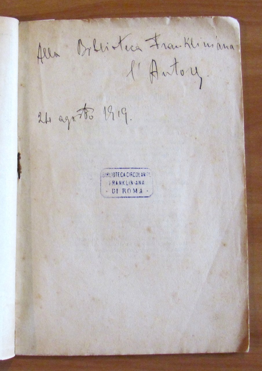 Tip. Forense, 1919. Brossura editoriale con lievi imperfezioni ai margini esterni delle copertine e al taglio superiore di due pagine dovuto all'apertura maldestra delle stesse. Timbro di vecchia appartenenza a Biblioteca e dedica dell'autore in antiporta. 17x25; pp.36. Raro e in Buono stato. , Molto buono (Very Good)