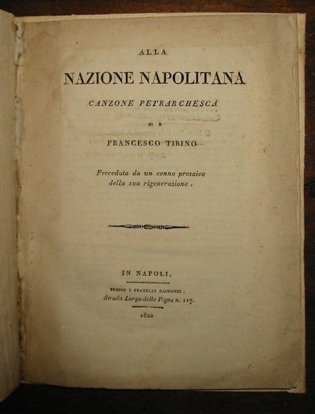Alla nazione napolitana. Canzone petrarchesca. preceduta da un cenno prosaico della sua rigenerazione