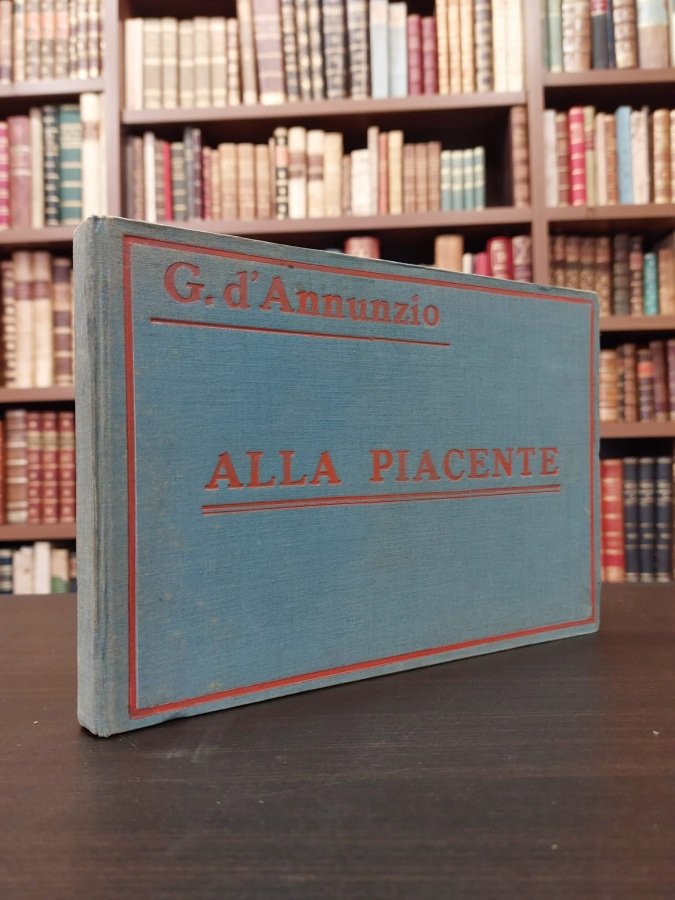 In-8° oblungo (cm. 15,3), legatura editoriale in tutta tela blu con titolo in rosso inquadrato da cornice al piatto anteriore, tagli cesellati; pp. 76 non numerate in stato molto buono (lievi e sporadiche fioriture). Stampa in rosso e nero al solo recto dell'autografo in facsimile. Contraffazione dell'edizione originale. Poemetto erotico dannunziano scritto nel 1927 ispirandosi a Elena Sangro, notissima attrice del cinema muto. Cfr. Falqui 40; Vecchioni 88a; Gambetti Vezzosi 264; Guabello 343. Ottimo esemplare. (NX)