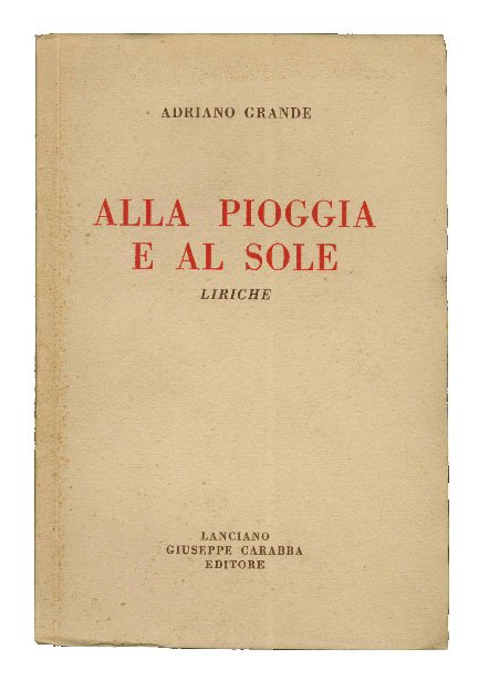 LIBROPrima edizione.CON AUTOGRAFO.Leggera fioritura e piccole gore alla brossura, tagli fioriti, ma per il resto ottimo esemplare pregiato da dedica autografa della moglie di Adriano Grande (in quel momento ancora impegnato come volontario nella Guerra d’Etiopia) ad Angelo Barile: «Per il signor Barile, con affettuosa amicizia a nome di Adriano, in Africa -- Lola -- gennaio 1936 XIV». All’occhietto e all’interno note a matita autografe dello stesso Barile.Quarta raccolta poetica di Grande stampata nel dicembre del 1935 dall’editore Carabba e uscita mentre il poeta ligure si trovava ancora in Africa come volontario con la Legione Parini. Composta da trentuno poesie oltre all’apertura con «Di pochi fiori un vaso» e alla finale «Epigrafe», la convinta adesione di Grande alla retorica patriottica e nazionalista del regime fascista - adesione che sarà indebolita proprio dall’esperienza nella Guerra d’Etiopia - si manifesta qui ancora chiaramente, come testimoniato in modo particolare dal componimento «Italia coraggiosa»: «Io t’amo, Italia, come il giovinetto / la luminosa dama che al balcone / s’affaccia. Egli non osa / fissarla a lungo perché il cuor gli trema: / ed io non oso a te gettar parole».