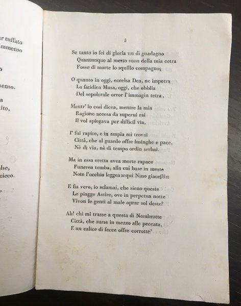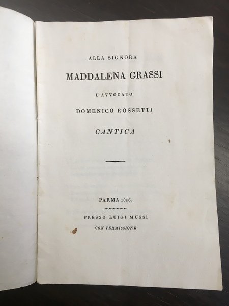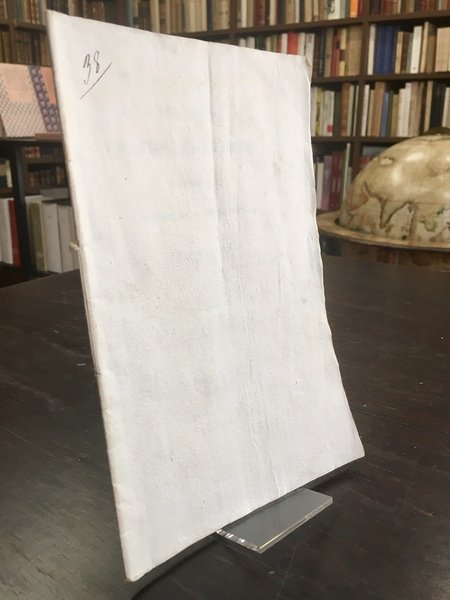 In-8° (cm. 21,3), brossura bianca coeva, pp. 15 [1b] con sporadiche fioriture. Edizione originale non comune. Buon esemplare. (OP1)
