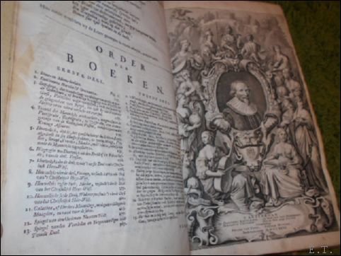 In folio, gebonden, vol marokijnleder, vergulde stempel op de voorplat, rug versierd met bloemvormige blindstempels, rug versierd met vergulde titel op oranje marokijnen etiket, (7) platte rugnerven, 2 titelgravures, 24x41cm, (13) 666pp(9) + (11)608pp + 67pp, waterstainded rijkelijk geillustreerd met gegraveerde vignetten en gegraveerde buitentekstpleten. Ridder, oudt raadt pensionaris van Hollandt, etc. Laatste druck; Waar in het 82 jaarig leeven des dichters; beneffens desselfs slaapeloose nachten, met Printverbeelding fijn verrijkt.