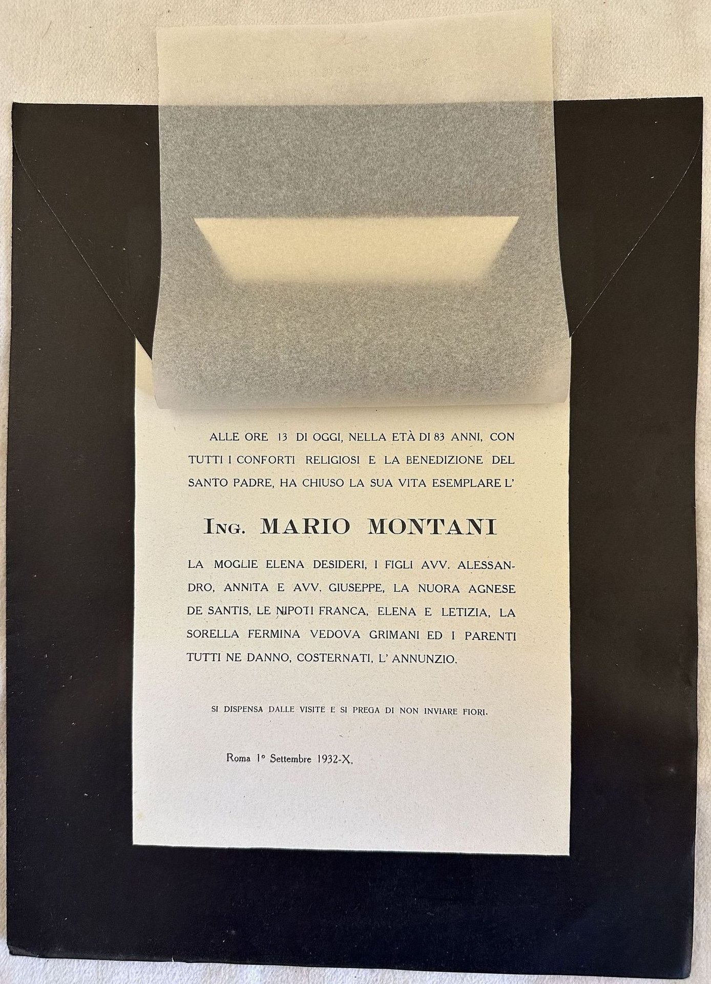ALLE ORE 13 DI OGGI, NELLA ETA DI 83 ANNI, CON TUTTI I CONFORTI RELIGIOSI E LA BENEDIZIONE DEL SANTO PADRE, HA CHIUSO LA SUA VITA ESEMPLARE L'ING. MARIO MONTANI ROMA 1 SETTEMBRE 1932