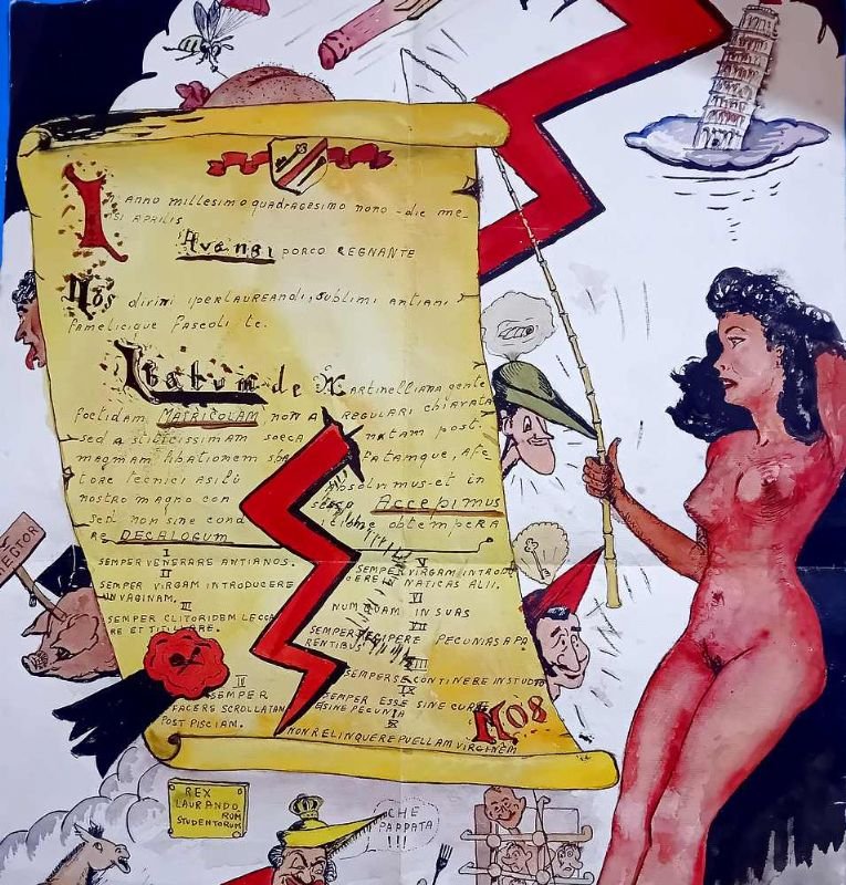 Allegoria goliardica universitaria con varie scene e decalogo, tra le figure la torre pendente - Pisa.