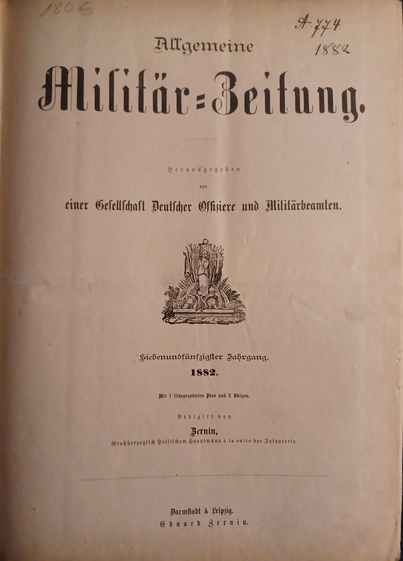 Mit einem Inhaltsverzeichnis am Anfang für alle 103 Ausgaben dieses Jahrgangs, 1 lithographierten Plan und 2 Abbildungen nach Skizzen. Die Zeitung erschien 2 x wöchentlich. Neben historischen Begebenheiten, Neuerungen und Berichten des deutschen Militärs enthält jede Ausgabe eine Buchkritik, Auszüge aus fremden Militär-Zeitschriften und 1 Seite themenbezogene Anzeigen.