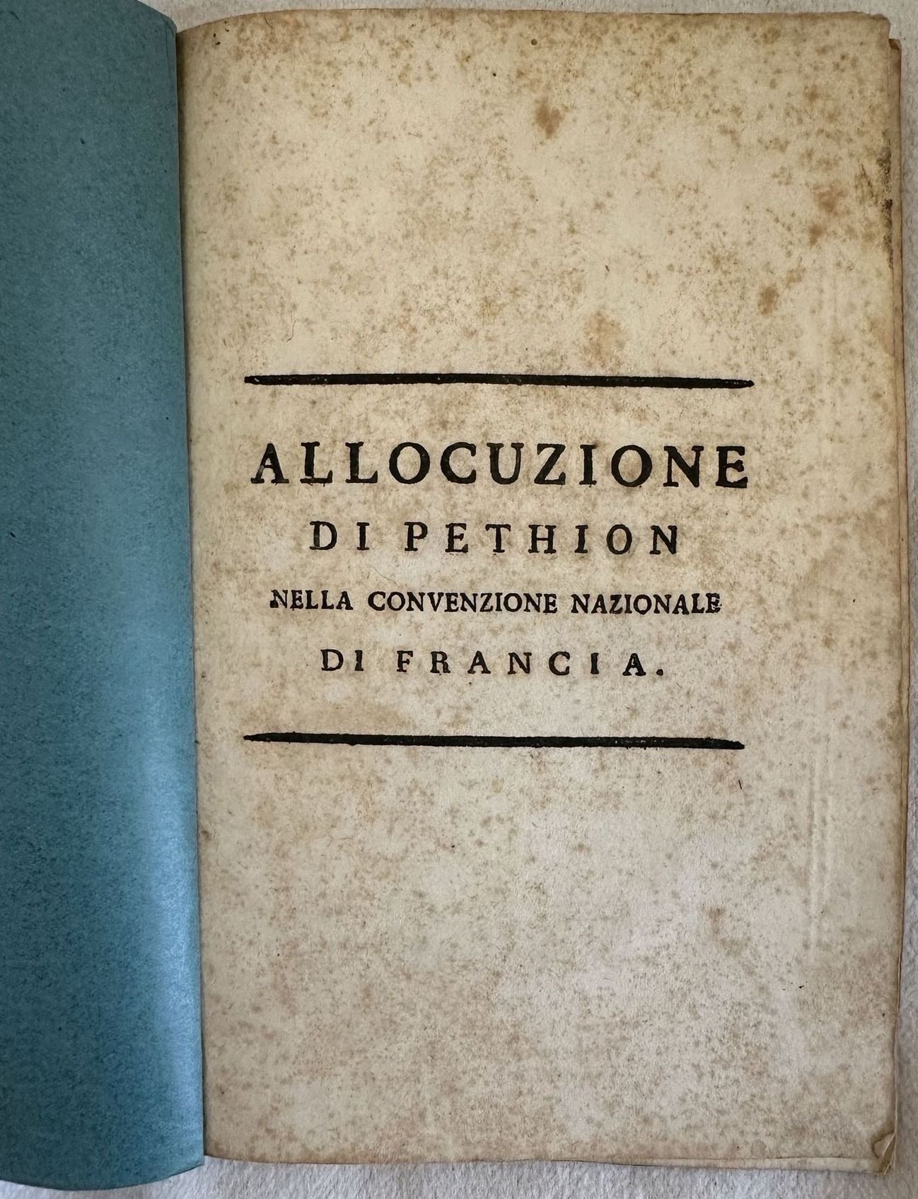 Rara edizione italiana di questo opuscolo, l'allocuzione del celebre avvocato, rivoluzionario e politico francese Jerome Petion de Villeneuve (1756-1794) tenuta nella Convenzione Nazionale di Francia della quale fu Presidente nel 1792. Senza data nè dati di stampa ma del 1793 circa. In buone condizioni. Copertina morbida coeva in ottime condizioni generali con lievi usure ai margini e dorso. Legatura in buone condizioni. All'interno le pagine si presentano in buone condizioni con fioriture. In 16. Dim. 18,5x12,5 cm. Pp. 14.Scarce italian edition of this pamphlet, the speech of the famous french lawyer, revolutionary and politician Jerome Petion de Villeneuve (1756-1794) held in Convenzione Nazionale di Francia of which he was President in 1792. Not dated with no indication of publisher but of 1793 circa.<BR>In good conditions. Soft coeval cover in very good general conditions lightly worn in the extremities. Binding in good conditions. Inside pages are in good conditions with foxing. In 16. Dim. 18,5x12,5 cm. Pp. 14.
