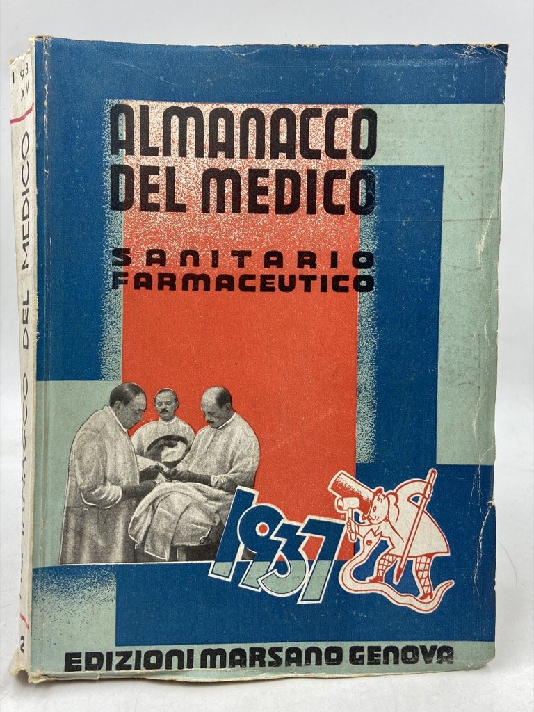 Brossura editoriale illustrata, cm 22x16, pp 475 (5) + numerose tavole pubblicitarie in velina e non. Almanacco rivolto ai medici italiani per il 1937, tra gli articoli: Brevi cenni nosografici dell’Etiopia, Le navi ospedale, La torre Balilla (colonia di Marina di Massa), Il Congresso Internazionale delle Levatrici a Berlino. L’istituto di Malariologia Ettore Marchiafava, Giornata Medica della XVII Fera di Milano, IV Congresso Stampa Medica Latina di Venezia, Il Nuovo Ospedale Giardino di Milano (di Massimo della Porta), La Centrale del Latte di Genova, e molti altri oltre a redazionali, caricature, necrologie, recensioni ecc.
