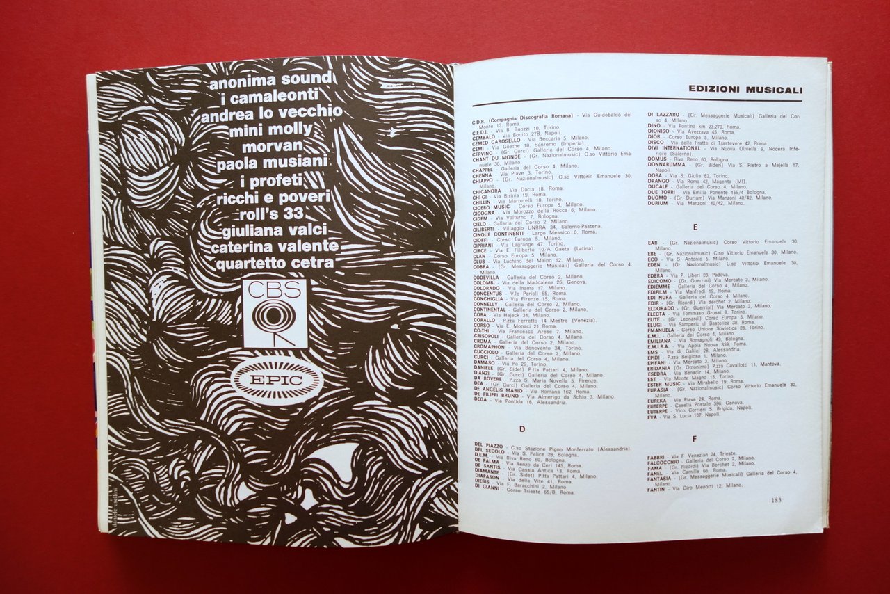Nunzio Lusso e Toni Bonavita (a cura di), † Almanacco della Canzone Trevi Editore, Roma 1969; cm 27,5x22; pp. 272 con numerosissime ill. fotografiche in b/n nel t. e fuori t.; tutto cartonato ed. ill. a colori. † Condizioni di conservazione Esemplare in buone condizioni con tracce d'uso; margini dei piatti, cerniere e cuffie con alcune minime abrasioni; qualche minimo graffietto ai piatti. Interni molto ben conservati. † Importante dettagliato almanacco musicale, contenente varie informazioni sui numerosi cantanti dell'epoca. Numerosissime le illustrazioni sia nel testo che fuori testo (vedi foto). † SETT218.L20583 N