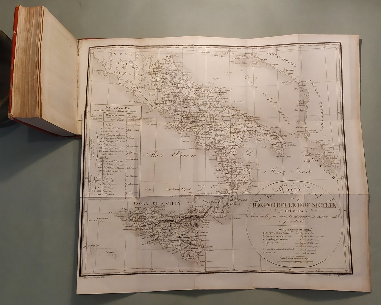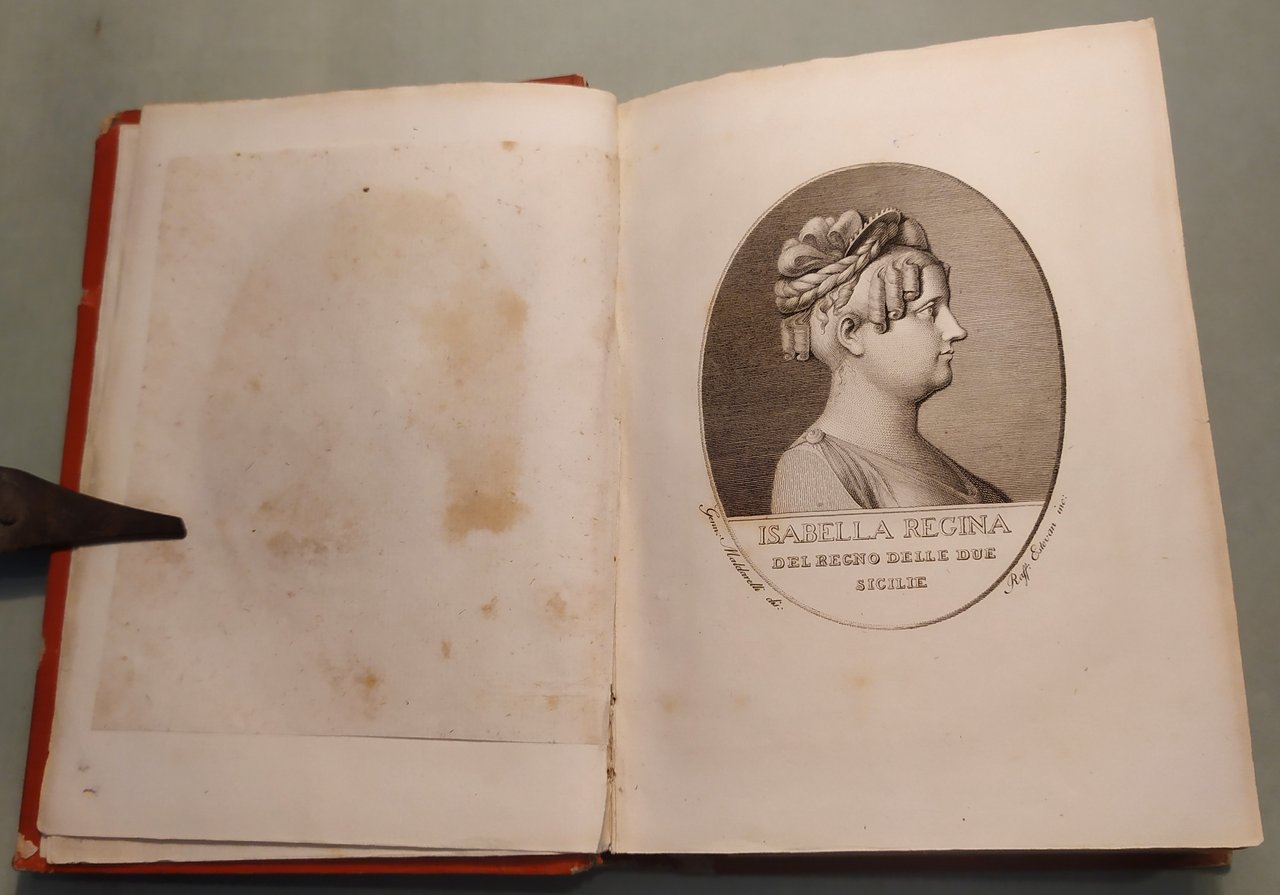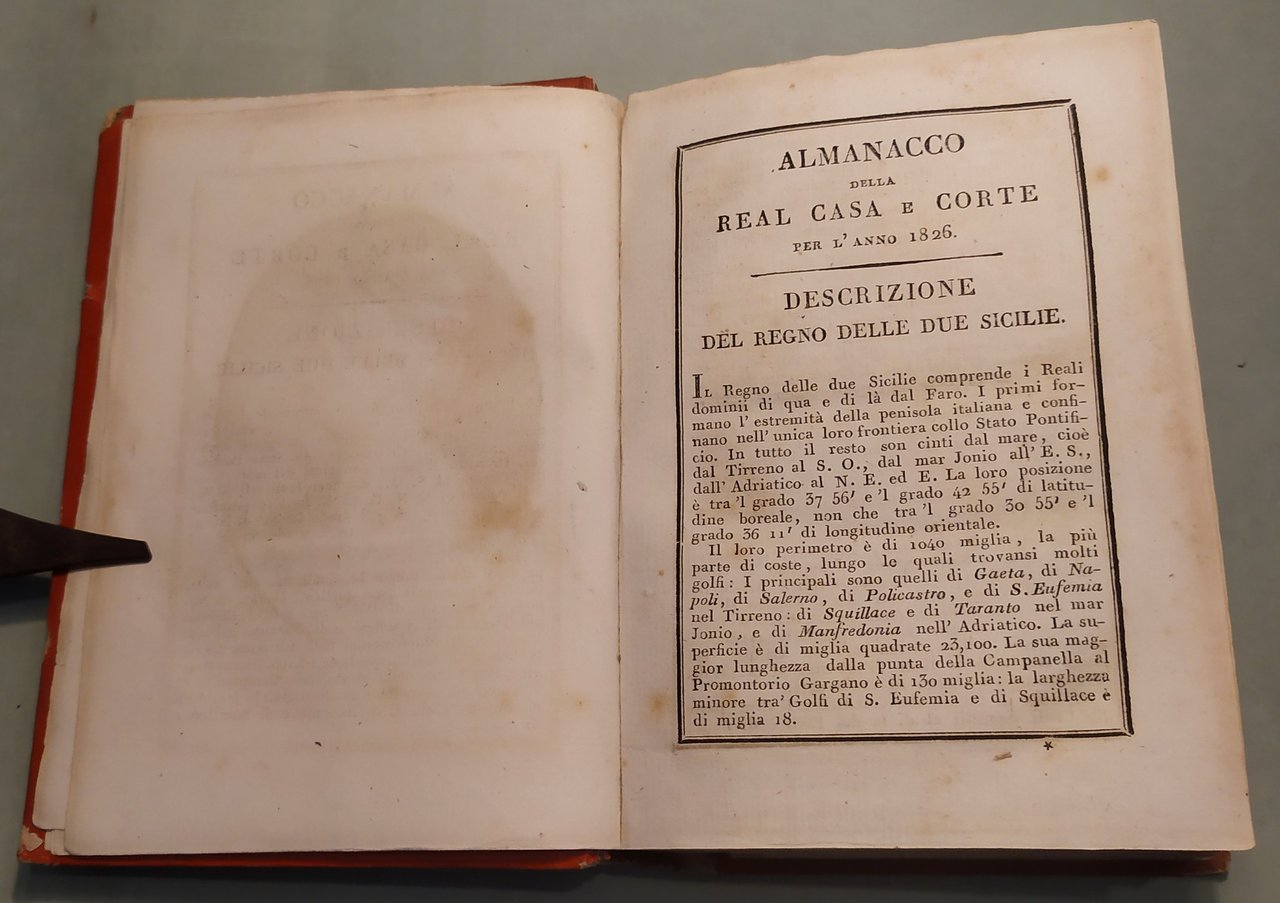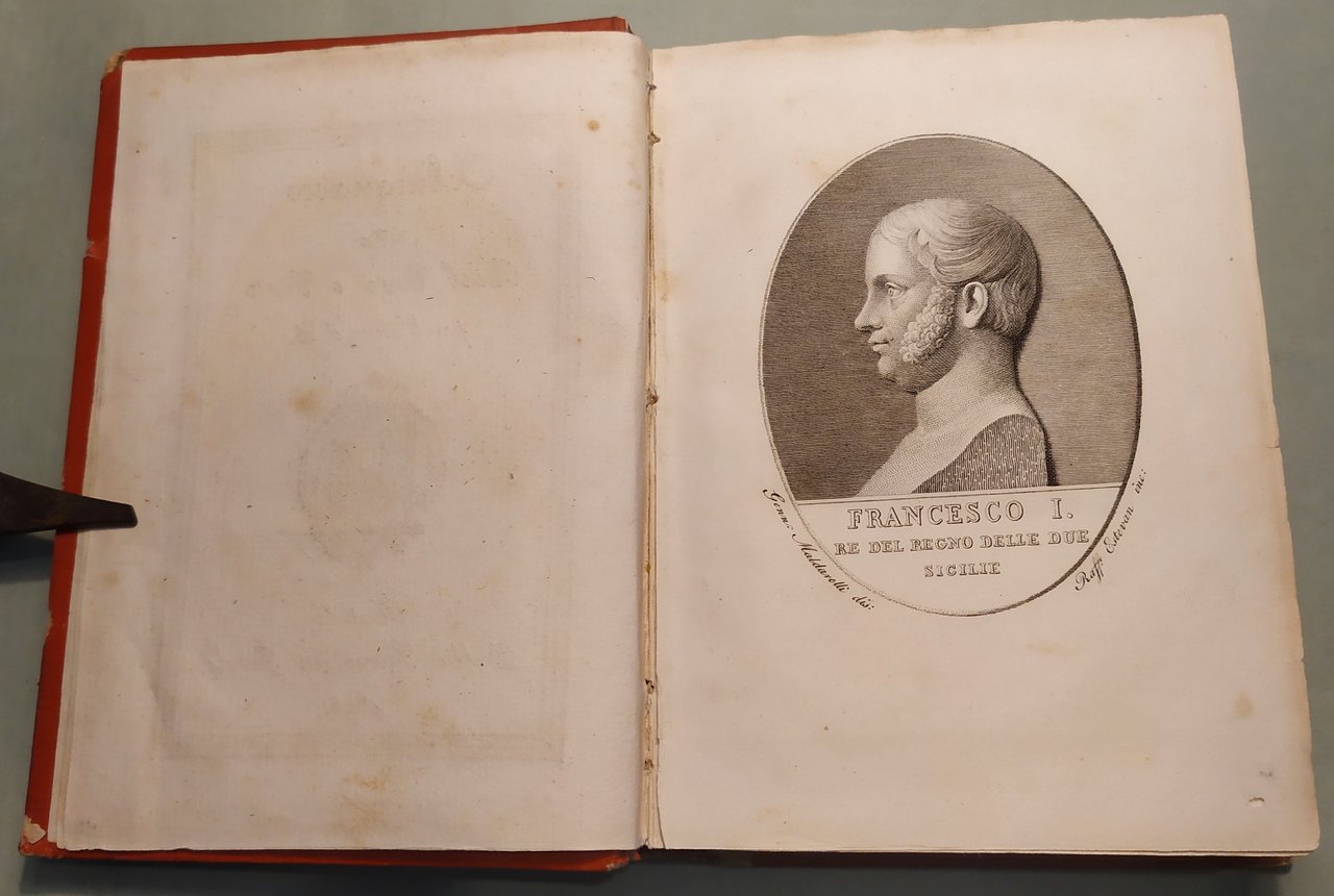 Napoli, Dalla Stamperia Reale, 1825. In 16mo; pp.LXXII, 212, 1 n.nn. con aggiunzioni e cambiamenti. Stemma borbonico al frontespizio. Ritratti in ovale di Francesco I e della Regina Isabella. In fine tavola spieghevole con la Carta del Regno delle Due Sicilie. Tela editoriale rossa, fregi in oro inquadrano i piatti, titoli dorati al dorso.