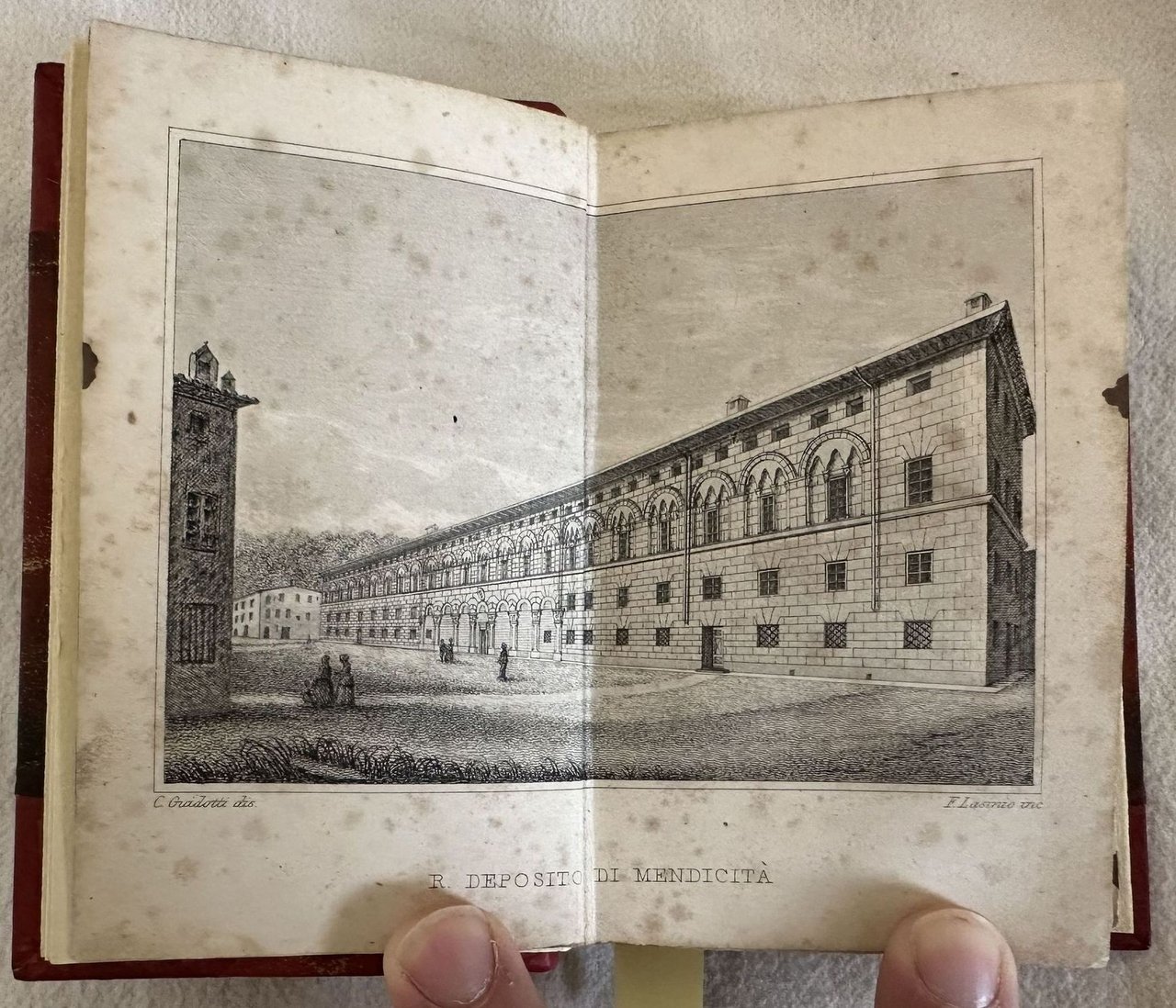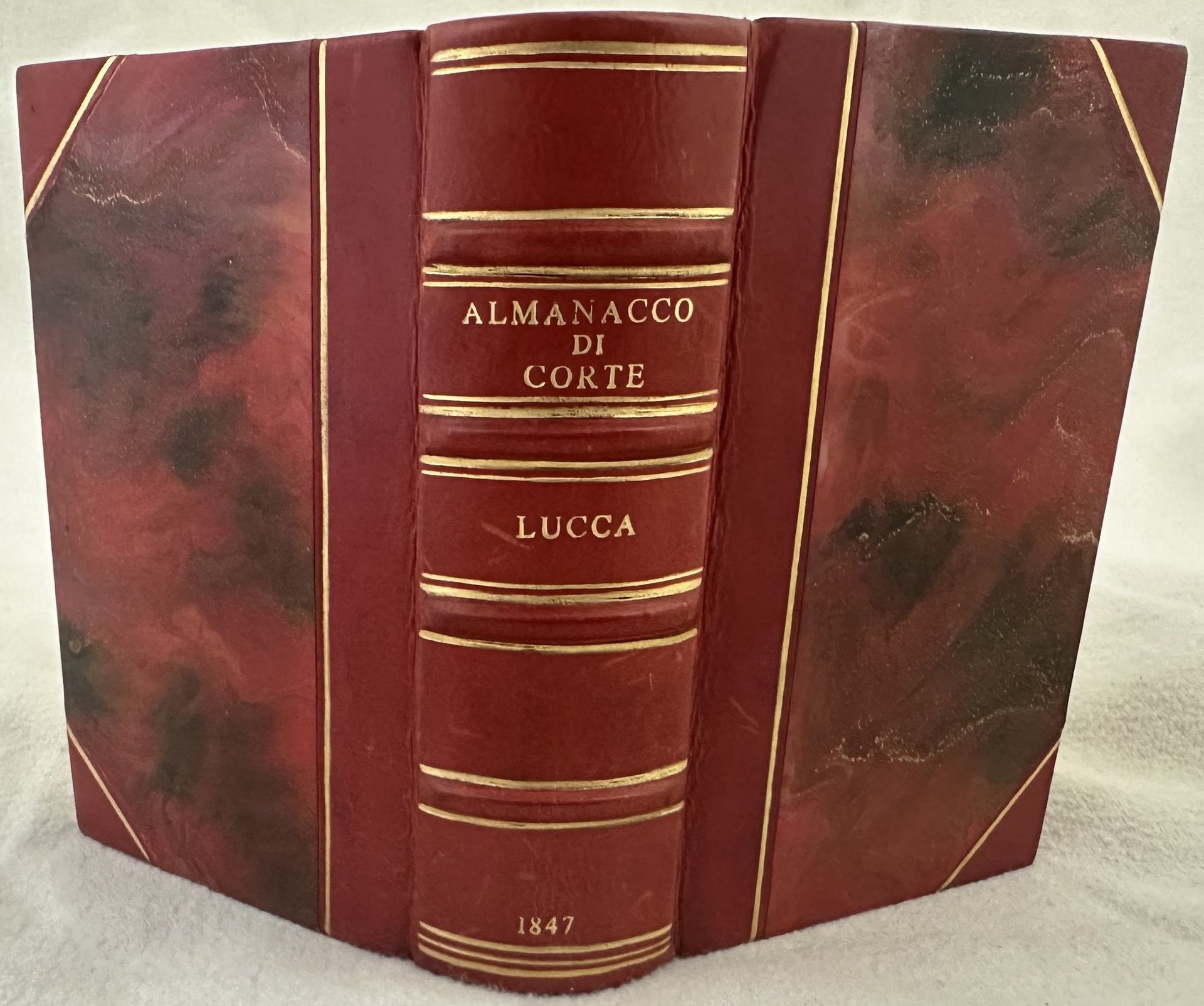 Finissimo Almanacco di Corte del Ducato di Lucca per l'anno 1847.<BR><BR>All'inizio descrizione del Regio Deposito di Mendicità e della Chiesa di San Giusto<BR><BR>Segue calendario solare e astronomico, pianeti e zodiaco, feste.<BR><BR>A seguire: Famiglia regnante del Ducato e sovrani e principi regnanti esteri colle rispettive famiglie e parentadi; Elenco di tutti i componenti della Corte (dai maggiordomi ai Ciamberlani, musicisti di camera, dispensa, cucina, orologiai, ufficio del guardaroba, veterinari ecc.), Consiglio di Stato e funzionari civili e militari, Ori e argenti, Orto Botanico, Ospizi e ospedali, Arrivo e partenza delle lettere, Scuole comunali di Lucca, Spettacoli pubblici, Marina di Viareggio; Elenco componenti dei comuni di Bagno, Borgo, Camajore, Capannori, Coreglia, Gallicano, Lucca, Minucciano, Montignoso, Pescaglia, Viareggio, Villa Basilica ecc.<BR><BR>Veduta del Regio Deposito di Mendicità.<BR><BR>In ottime condizioni.<BR><BR>Copertina in mezza pelle a quattro nervi con titolo e decorazioni in oro al dorso con lievi usure ai margini e dorso. Legatura in ottime condizioni. Pagine in ottime condizioni con rare fioriture. In 24. cm 12,5x8 cm. Pp. 300+CCVIII+1 tav.
