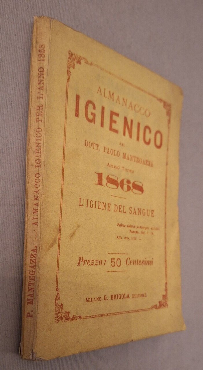 ALMANACCO IGIENICO DEL DOT. PAOLO MANTEGAZZA 1868 MILANO G. BRIGOLA ED.In 16°, brossura editoriale, ill. in b/n.Lievissimi segni alla copertina. Pagine fresche e pulite.