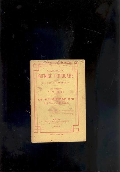IN 16, pp.152, COPERTINA EDITORIALE CON TITOLO ROSSO SU FONDO GIALLO. LUNARIO VENTESIMO TERZO PER IL 1888 SULLE FALSIFICAZIONI DEGLI ALIMENTI E DELLE BEVANDE.<BR>PUBBLICITA' SU CARTA VERDE E ROSA ALLE PRIME 3 c. MANCA L'ULTIMA CARTA CON IL CALENDARIO PER IL 1888. MACCHIOLIONE ALLA 1° DI COPERTINA CON FIRMA DI APPARTENENZA IN ALTO, DORSO ALLENTATO,INTERNO OTTIMO. ID 3973