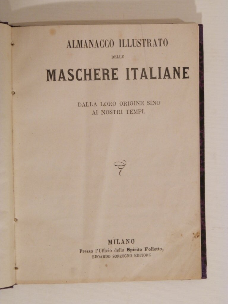 16°, cm 19, pp.115, con 21 tavole incise a piena paggina raffiguranti le maschere della commedia dell'arte. La data si ricava dal calendario posto al fondo. Legatura in mezza tela viola con piatti in carta marmorizzata. . *** TUTTI I NOSTRI LIBRI SONO VISIBILI PREVIO CONTATTO MAIL O TELEFONO NELLA NUOVA SEDE DI MILANO: LIBRERIA COSMOPOLIS, VIA JOMMELLI, 22. ***