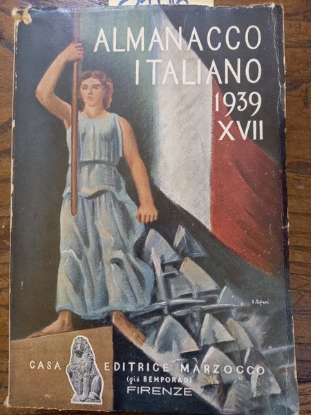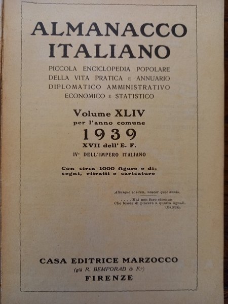 Almanacco Italiano 1939. Piccola enciclopedia popolare della vita pratica e annuario diplomatico, amministrativo e statistico. Anno XLIII. Firenze, Marzocco, 1938.