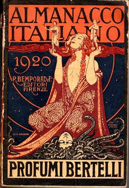 ALMANACCO ITALIANO. Piccola Enciclopedia popolare della vita pratica…. Volume XXV per l'anno 1920. Con la cronaca illustrata dell'anno 1919… Con circa 1000 figure e disegni, carte geografiche nel testo e fuori testo, una scelta di caricature, ecc. Copertina di E. Anichini.