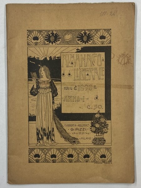 Leggera brossura editoriale illustrata, cm17x24, pp (2) 76 (2); alcune pagine pubblicitarie di aziende dell’epoca intercalate al testo. Con scritti di Barbiera Raffaello, Buzzi Paolo, Borelli Giovanni, Capelli Luigi Mario, Guarda Giulio, Massara Gius. Leone, Negri Gaetano, Panzacchi Enrico, Patta Aldo, Tincajoli Oreste Ferdin, Venturini Luigi. Almanacco liberale-monarchico con alcuni interessanti interventi sulla produzione storiografica del 1897 sul Risorgimento (Capelli), la libertà di stampa (Patta), l’istruzione per le donne (Guarda).