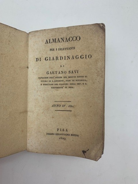 In 24 (cm 8 x 13), pp. 283 + (1 bianca). Brossura editoriale. Comprende il calendario iniziale dell'anno con elenco delle piante che fioriscono per ciascun mese e la continuazione del saggio sulla fioritura delle piante.