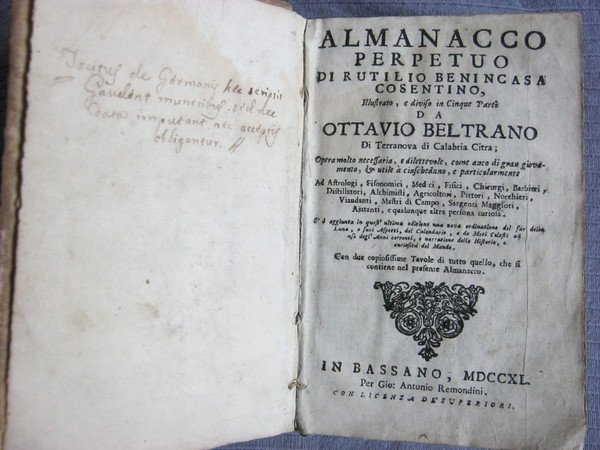 .Almanacco perpetuo di Rutilio Benincasa cosentino, illustrato, e diviso in cinque parti, da Ottavio Beltrano di Terranova di Calabria Citra, . Con due copiosissime tavole di tutto quello che si contiene nel presente Almanacco. - Un volume in 8vo (11x17,5 cm) di (12)-696 pagine, con numerose illustrazioni xilografiche, di diversa grandezza, nel testo. Altro front. a c. 2M5r: Quinta parte dell'Almanacco perpetuo fisico trattato d'aritmetica ove con facilita s'insegna il vero modo d'apprenderla da se medesimo in breve tempo, . diviso in cinque opuscoli, . - Piccolo foro nel centro della pp7/8 che interessa due vignette. Per il resto, nessun difetto, cosa rara per questo tipo di pubblicazioni che erano sfogliate sempre ed usate pesantemente. Tagliata forse una pagina bianca in fine (che non rientrava però nella segnatura). Modesta legatura coeva in tutta pergamena che, al contrario dell'interno, presenta numerose usure, e una mancanza di 3 cm alla pergamena del margine inferiore del piatto. - Rutilio Benincasa (Torzano 1555-1626) fu astronomo, astrologo, anche se sono poche le notizie storiche su questo personaggio al cui nome sono associate vicende leggendarie, presenti talora anche nel folklore europeo o nella tradizione letteraria classica, per cui a livello popolare è considerato una delle incarnazioni del prototipo dello stregone. Il suo nome è legato alla sua opera più conosciuta, l'Almanacco Perpetuo, scritta nel 1587, e stampata per la prima volta nel 1593. Moltissime le edizioni che furono ristampate nel corso dei secoli, diventando modello per altri almanacchi successivi, come il Barbanera, considerato il suo più diretto erede. Dopo la morte di Rutilio, l'Almanacco fu aggiornato da altri, tra cui il più importante fu Ottavio Beltrano. Questa edizione remondiniana non è comune (solo 3 copie censite da Sbn nelle biblioteche pubbliche italiane).