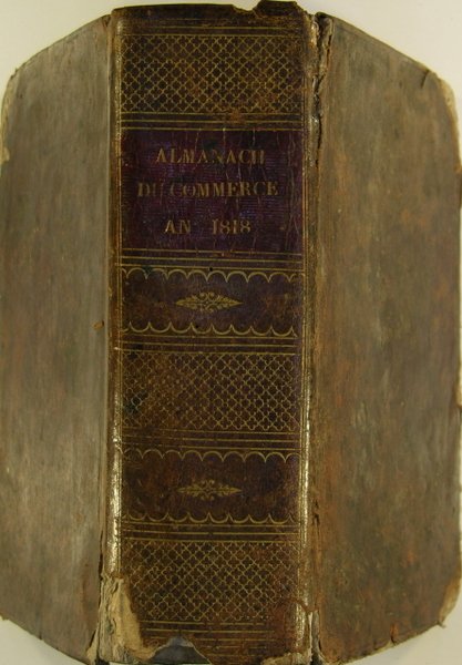 1818, de l’imprimerie J. Smith. Fort volume in/8 reliure plein veau brun, dos lisse à caissons dorés et pièce de titre rouge, 1125 pages, 6 ff. de catalogue. Reliure abîmée : manque en coiffe inférieure et aux quatre coins, mors partiellement ouvert. Une page de journal collée en page de garde (M. Thiers à Trouville.). Manque les 3 premières pages de l’ouvrage. Contient : tableau des principales productions industrielles et commerciales de France, sa population., sur Paris : les manufactures, banques, . différents métiers (le “Limonadier Véfour au Palais Royal est déjà cité".), en province : renseignements sur les départements, sites remarquables, artisans et autres, auberges, population., les principaux états et villes du monde, liste des brevets d’invention accordées en 1817, journaux.