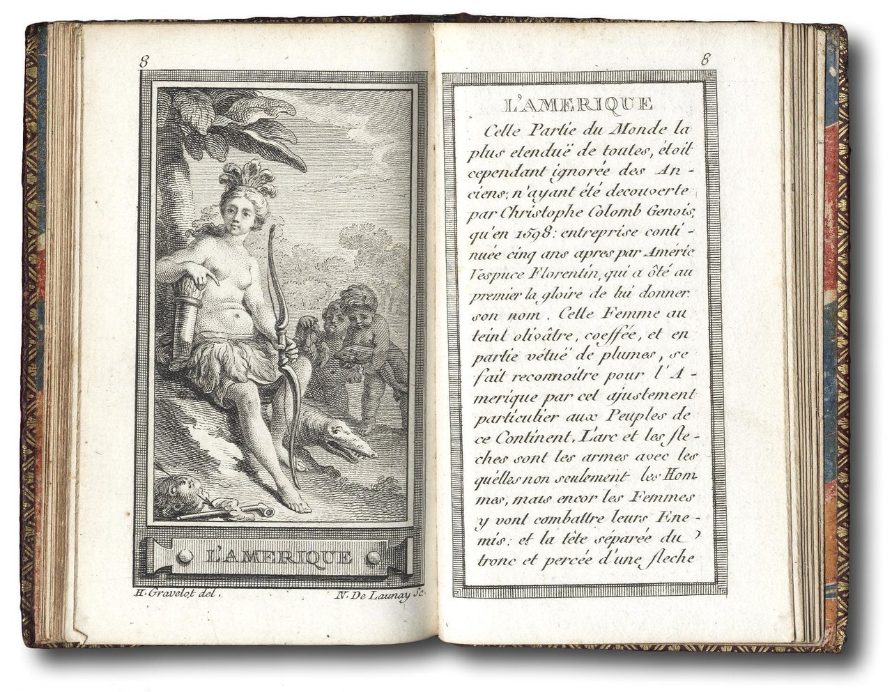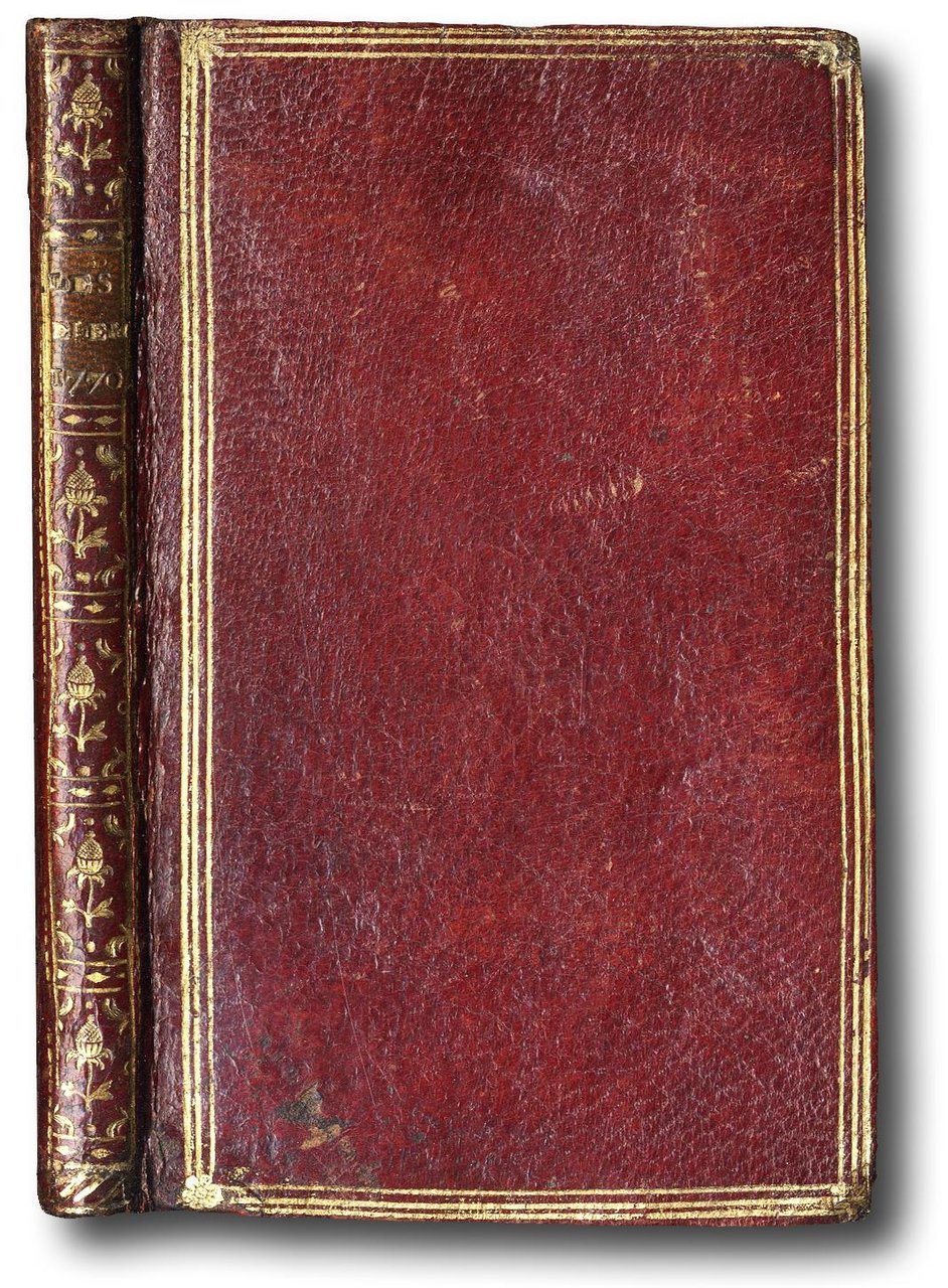in-18, (114x70 mm), leg. coeva marocchino rosso con fregi e filetti dorati, ff. (29) di cui 12 con incisioni in rame (verso bianco); front. inc. in rame; testo inciso. Uno dei volumi della famosa serie di Almanacchi pubblicati da Cochin e Gravelot dal 1764 al 1780. Nove dei 17 volumetti furono incisi da disegni di Hubert Francois Gravelot (1699-1773), otto da disegni di Ch. Nicolas Cochin II (1715-1790). Ogni volume aveva un titolo proprio. In questo intitolato ''Les elemens, les IV. parties du monde, les saisons'', si trovano 12 tavole allegoriche, da disegni di Gravelot incisi da vari ( Prevost, de St. Aubin, Massard, Delongueil, De Launay ecc.), accompagnate ciascuna da una descrizione. Il frontespizio, sempre da Gravelot, è inciso da De Ghendt e raffigura un globo terrestre e simboli allegorici delle quattro stagioni; la tavola dell'America raffigura un pellerossa.