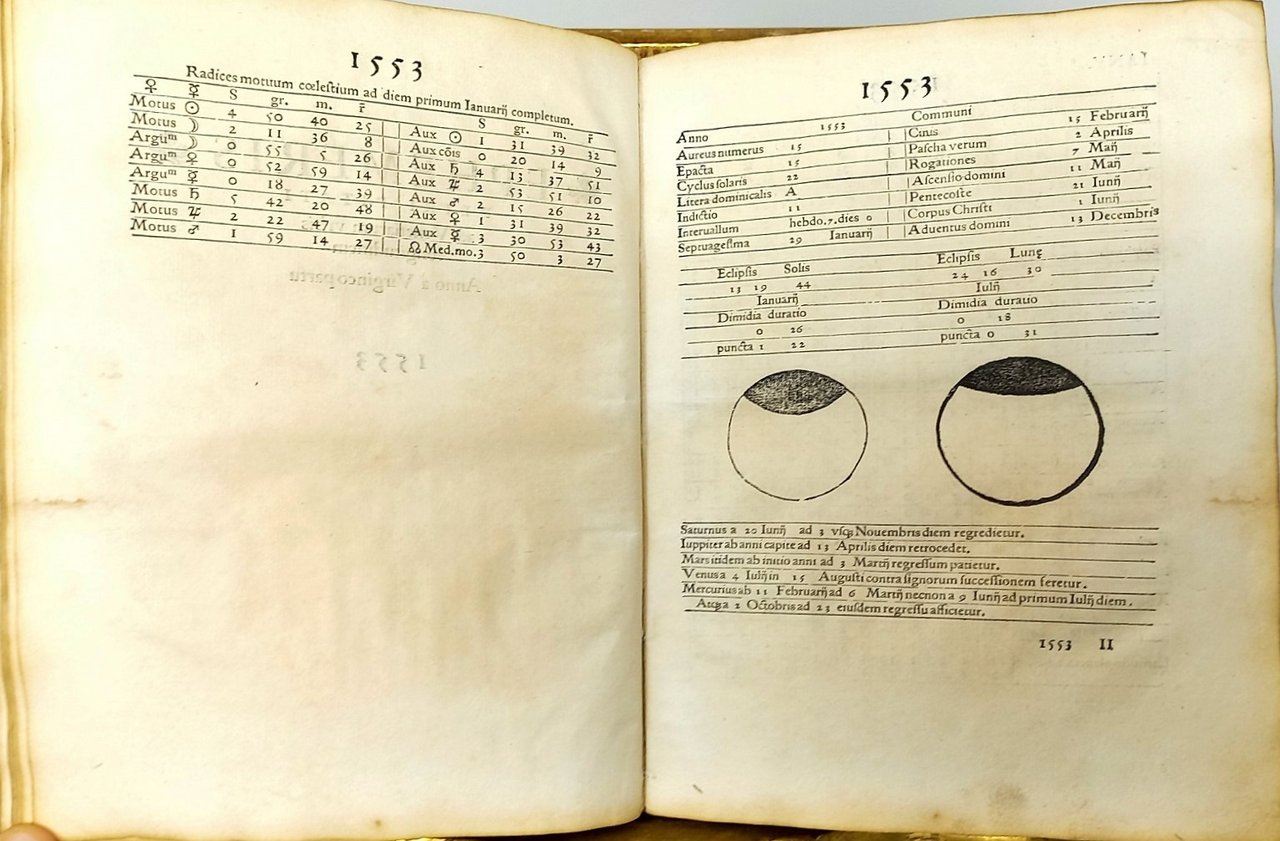 >in-8 (mm 217x161), ff. 57, 1 bianco, (154) che includono le effemeridi del periodo 1552-1562, capilettera xilografici, numerose tabelle e schemi, alcune figure nel testo che illustrano le fasi lunari. Legatura in piena pergamena floscia coeva, traccia di legacci ai piatti. Interessanti numerose annotazioni e calcoli astronomici di mano coeva alle sguardie, al foglio bianco e al frontespizio delle "Ephemeris" per l'anno 1552, in cui l'antico proprietario si era dilettato nel calcolare le posizioni dei pianeti nell'anno di nascita dell'Autore (1494). Al verso dell'ultimo foglio dell'opera altri calcoli astronomici, di mano coeva, con oroscopo riferito probabilmente ad una certa Chiara (Garnoli?). Segue, al recto della sguardia libera posteriore, oroscopo discorsivo in italiano sempre vergato a mano; al verso e al contropiatto posteriore altri calcoli di effemeridi probabilmente riferiti all'anno 1563. Pitati, astronomo veronese del secolo XVI, diede il suo nome al cratere lunare Pitatus. Fu celebre per aver proseguito le effemeridi di Johannes Stoffler (pubblicate a Tubinga dal 1482 al 1551) fino al 1562; nel 1542 pubblicò l'Almanacco nuovo, che si può considerare come la prima effemeride italiana (per gli anni 1543-1556), ovvero un gruppo di tavole numeriche che forniscono le coordinate degli astri (o altri elementi variabili con il tempo) a intervalli prefissati ed equidistanti fra loro, per es. di giorno in giorno oppure di ora in ora. La presente edizione contiene le effemeridi dal 1552 al 1562. Non comune. Cantamessa parla di una variante della presente edizione con un bifolio in più, ma gli esemplari trovati online nelle biblioteche hanno lo stesso numero di pagine del nostro esemplare.