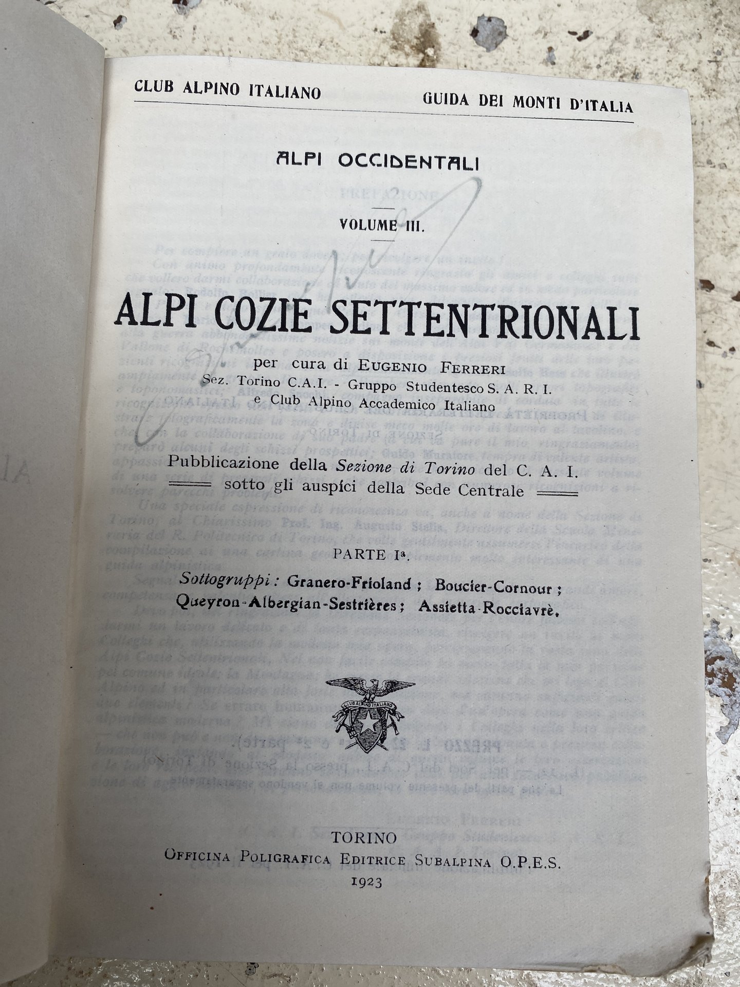 Vol. unico, in -16, pp.XII, 510, numerose piantine a colori, illustraz. b/n, a cura della Sezione di Torino del C. A. I. leg. t.tela con piccola lacuna al bordo del piatto ant. nel complesso buone condiz.