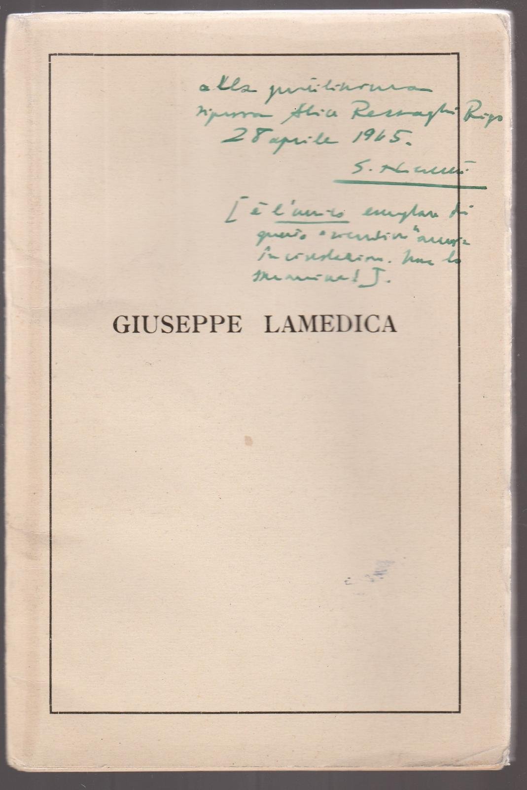 GIOACCHINO NICOLETTI GIUSEPPE LAMEDICA TIP. CUGGIANI ROMA 1929 L 4587 COPERTINA MORBIDA EDITORIALE CON DEDICA E DATA DELL'AUTORE AL PIATTO ANTERIORE, UNA PIEGA AL MARGINE CHE VA AD INTERESSARE LE PRIME 10 PAGINE, AL FRONTESPIZIO FOTOGRAFIA DI GIUSEPPE LAMEDICA N. PAG. 31 CM. 19 X 13